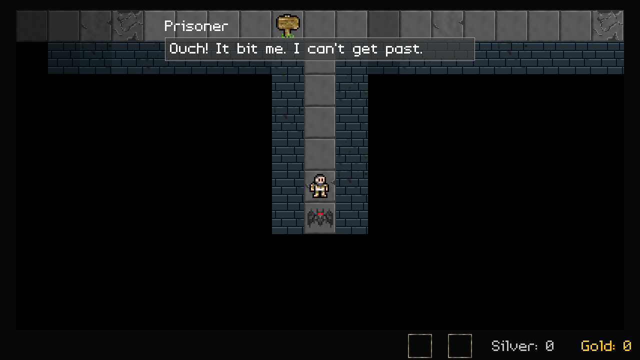 This is where the Prisoner's hasDagger variable comes into play. When the player walks into a bat, we test to see if the player has the dagger. If so, the bat is killed by setting its alive state to ALIVE_DEAD. However, if the player doesn't have the dagger, the Prisoner will complain the bat bit him. As the bat is solid, it becomes impassable and prevents the player from proceeding any further. That's more or less it for the Blacksmith, coins, and bats. To enable them in our dungeon, we need to remember to add them to initEntityFactory:
