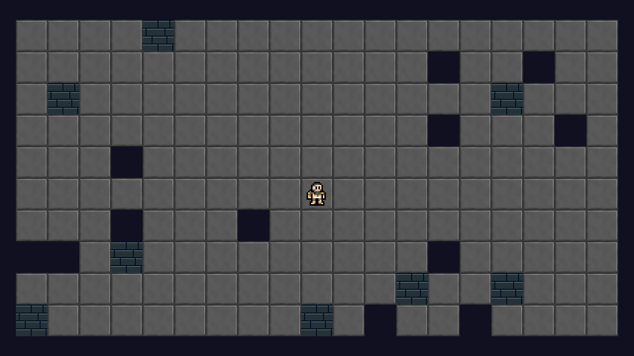Introduction Our dungeon will not be limited to a single screen (although it could be, since it could be designed as a flip screen affair where moving past the bounds of one screen takes you to another). We'll be going the traditional route of scrolling the map as the player moves around. For the most part, the player will always be in the centre of the screen, other than when at the limits of the map. We also want to prevent the player from walking into walls and holes in the ground. Extract the archive, run cmake CMakeLists.txt, followed by make, and then use ./adventure02 to run the code. You will see a window open like the one above, showing the prisoner on a tiled background. Use WASD to move around. Compared with the first tutorial, the dungeon is now three times larger. You will find you can move around a larger area, but are prevented from moving into the hole (black zones) and walls (beige-ish squares). Close the window to exit. Inspecting the code We've not had to make too many changes to the code to introduce mapping and collision to the map. We'll start with defs.h: