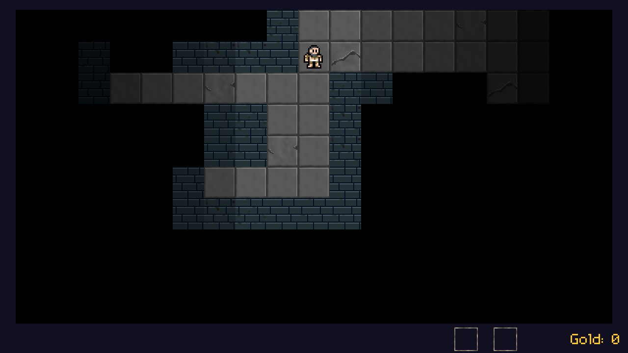 Introduction Adding fog of war to our dungeon will add a sense of mystery to it, and also encourage the player to explore. Not being able to see all the items, etc. scattered throughout right away means we need to go and have a good look around. We'll achieve this in our dungeon by overlaying black squares on squares that hasn't been explored or sighted. These squares will brighten as we get closer to them. Extract the archive, run cmake CMakeLists.txt, followed by make, and then use ./adventure07 to run the code. You will see a window open like the one above, showing the prisoner on a tiled background. Use WASD to move around. You'll find the dungeon is now dark and possibly a bit more difficult to navigate until you uncover all the squares. There are items to be found through exploring. Close the window to exit. Inspecting the code The principle behind our fog of war implementation is to overlay a series of black squares over the seen, on tiles that are yet to be explored or uncovered. The alpha value of these squares will change depending on our distance from them (but once lit, they won't darken as we move away from them). Line of sight will play a part in uncovering the tiles. A new file has been created to handle all the fog of war logic, called fogOfWar.c. We'll come to it in just a moment. For now, let's start by looking at structs.h, where we've added a new struct: