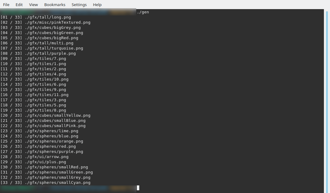 The reason for this sorting will become clear later on. It should be noted that we're only sorting the images that were actually loaded, which might be different from the number of files that we scanned. With all that done, we can loop through our list of images and print them out. When you run the program, you will see a list like this: [01 / 33] gfx/tall/long.png [02 / 33] gfx/misc/pinkTextured.png [03 / 33] gfx/cubes/bigGrey.png [04 / 33] gfx/cubes/bigGreen.png [05 / 33] gfx/cubes/bigRed.png [06 / 33] gfx/tall/multi.png [07 / 33] gfx/tall/turquoise.png [08 / 33] gfx/tall/purple.png [09 / 33] gfx/tiles/7.png [10 / 33] gfx/tiles/1.png [11 / 33] gfx/tiles/2.png [12 / 33] gfx/tiles/4.png [13 / 33] gfx/tiles/10.png [14 / 33] gfx/tiles/6.png [15 / 33] gfx/tiles/9.png [16 / 33] gfx/tiles/11.png [17 / 33] gfx/tiles/3.png [18 / 33] gfx/tiles/5.png [19 / 33] gfx/tiles/8.png [20 / 33] gfx/cubes/smallYellow.png [21 / 33] gfx/cubes/smallBlue.png [22 / 33] gfx/cubes/smallPink.png [23 / 33] gfx/spheres/lime.png [24 / 33] gfx/spheres/blue.png [25 / 33] gfx/spheres/orange.png [26 / 33] gfx/spheres/red.png [27 / 33] gfx/spheres/purple.png [28 / 33] gfx/ui/arrow.png [29 / 33] gfx/ui/plus.png [30 / 33] gfx/spheres/smallRed.png [31 / 33] gfx/spheres/smallGreen.png [32 / 33] gfx/spheres/smallGrey.png [33 / 33] gfx/spheres/smallCyan.png But that's not very useful right now. In the next part, we'll look at actually creating the atlas image itself. Purchase The source code for all parts of this tutorial (including assets) is available for purchase: From itch.io It is also available as part of the SDL2 tutorial bundle: | |