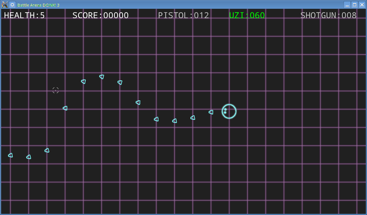 Introduction Note: this tutorial series builds upon the ones that came before it. If you aren't familiar with the previous tutorials, or the prior ones of this series, you should read those first. This first tutorial will explain how to read the mouse in SDL2. Extract the archive, run cmake CMakeLists.txt, followed by make to build. Once compiling is finished type ./bad03 to run the code. A 1280 x 720 window will open, with a dark grey background over which a light purple grid is shown. A targetter will be shown that will track the mouse movements. The main character, Donk, will also display. Donk can be moved with the WSAD control scheme and will always face the targetter. Use the left mouse button to fire. The mouse wheel will cycle through the available weapons. The right mouse button will reload the pistol when it is out of ammo. Close the window by clicking on the window's close button. Inspecting the code Reading the description and looking at the screenshot above, it should be clear that there have been a number of changes made in this part of the tutorial. Some of these we'll be skipping over (such as the text drawing) as they have been covered in previous tutorials. We'll focus on the mouse interactions and firing the bullets. Starting with handling the mouse buttons, we'll take a look at the changes to input.c. We've added two new functions - doMouseButtonUp and doMouseButtonDown: