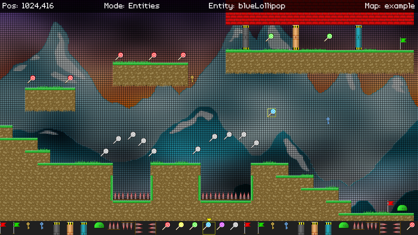 Introduction It's now time to start adding entities to our map. Our game supports a number of different items: lollipops and keys to collect, spike traps to avoid, and doors to open. There are also two flags: red and green, that mark the beginning and end of our stage, respectively. Like with selecting tiles, we'll be able to scroll through the available entities with the mouse wheel, and place them on the map. There are also some restrictions - only one player, red flag, and green flag is allowed, and they cannot be removed. We'll look at how this is handled as we go along. Extract the archive, run cmake CMakeLists.txt, followed by make, and then use ./editor03 -edit example to run the editor. You will see a window open, displaying a scene like the one above. The controls from the previous tutorial apply. In addition, pressing 1 on the keyboard will enter tile edit mode, while pressing 2 will enter entity edit mode. As with editing tiles, the mouse wheel can now be used to cycle through the available entities. The currently selected entity is shown by the cursor, and also at the bottom of the screen. Click the left mouse button to place an entity on screen. Click the right mouse button, while over an existing entity, to remove on. Notice how the player, red flag, and green flag cannot be removed. In addition, attempting to add a new one will move the existing one to the new position. Once you're finished editing, press Space to save the map. If there are errors, these will be logged to the terminal. With your map saved, close the window to exit. As before, you can play the map by using ./editor03 -map example. The goal of the game is simply to collect all the lollipops on the stage, and make it to the green flag. If the player is killed by spikes, they will respawn by the red flag. Touching the green flag when all the lollipops are collected will end the game, and the program will exit. Inspecting the code This update touches on almost all of the functions in editor.c, so this part is going to end up being quite long. However, it will be simple to understand, as we'll see. We'll also snip out code we're not interested in, to reduce the noise a bit. Firstly, we've added a new enum: