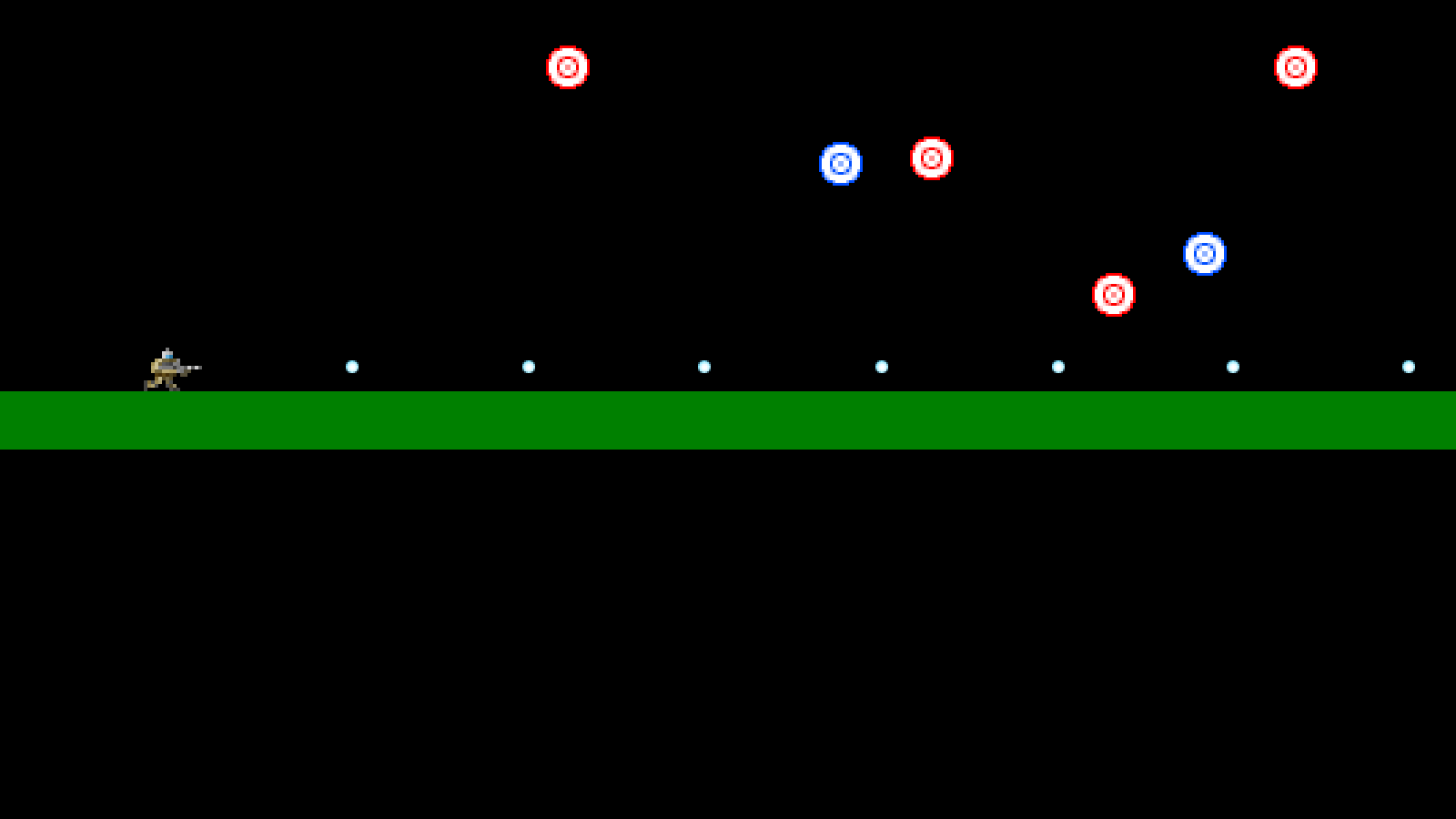 We're first extracting the Target from the entity's `data` field, then decreasing the damageTimer, capping it at 0. After that, we're testing the entity's horizonal position. If `x` is less than 25 pixels from the right-hand side of the screen (taking into account the target's texture width during the calculation), we're going to set it back to 25 pixels from the screen width, and then set its `dx` to -4. In effect, this means that when the target reaches the right-hand side of the screen (more or less), we'll reverse its direction, so that it bounces back the other way. The same is true of when the target reaches less than 25 pixels on the left-hand side. The position is reset to 25 and the `dx` is set to 4, to make it move to the right. Next, we're checking if the target is on the ground (onGround is 1). If so, we're setting the entity's `dy` to BOUNCE_HEIGHT (defined as the negative of double MAX_FALL_SPEED). This will make the Target bounce (in a somewhat unnatural fashion). Finally, we're updating the entity's `hitbox`. We're only changing the `x` and `y` values of the `hitbox`, as the dimensions of the Target do not change. If we didn't update the hitbox like this, it would remain as the initial (0,0), meaning we'd had to shoot at the top-left of the screen to hit our targets. Again, we'll see more on hitboxes when we come to dealing with our bullets. Our `draw` function is next. If you've worked through the SDL2 Shooter 2 tutorial, some of this will look familiar: