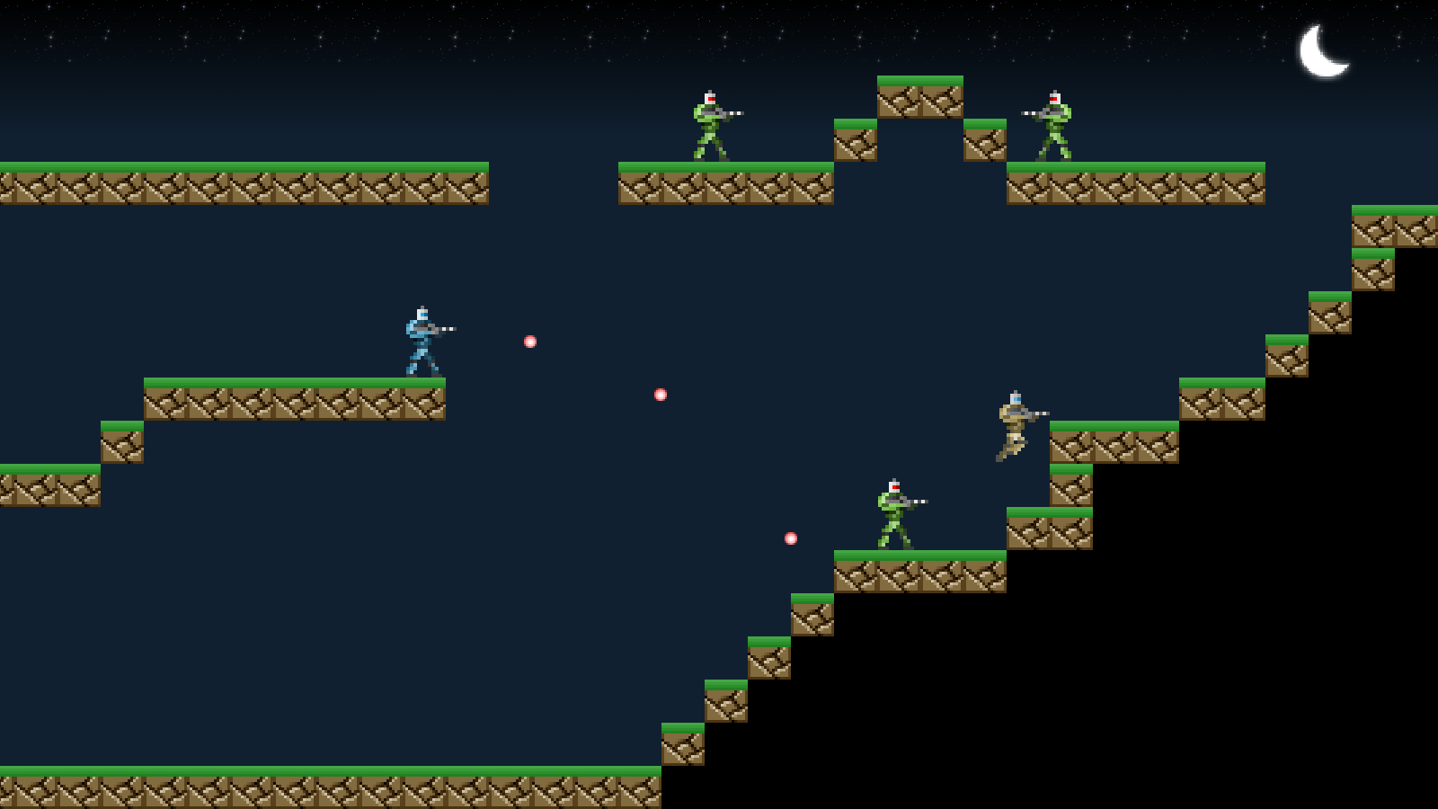 Introduction So far, we've been constrained to a single screen our game. It's time to make it so that we've got a larger map to explore. In this part, we'll expand the size of the map so that there is more to do and see. Extract the archive, run cmake CMakeLists.txt, followed by make, and then use ./gunner07 to run the code. You will see a window open like the one above. The main player character starts off at the top left-hand corner. The same controls from past tutorials apply. The player can now move around the map, jump on the various map blocks, and battle the enemies. The map is now around twice the width of the previous one. Once you're finished, close the window to exit. Inspecting the code We've not only added in the scrolling to this part of the tutorial, but also added in a new enemy: a blue soldier. You'll have noticed that he doesn't fire straight ahead, but aims at the player. We'll see how he works in a little while. For now, we'll focus on how the map scrolling works. Starting with defs.h:
