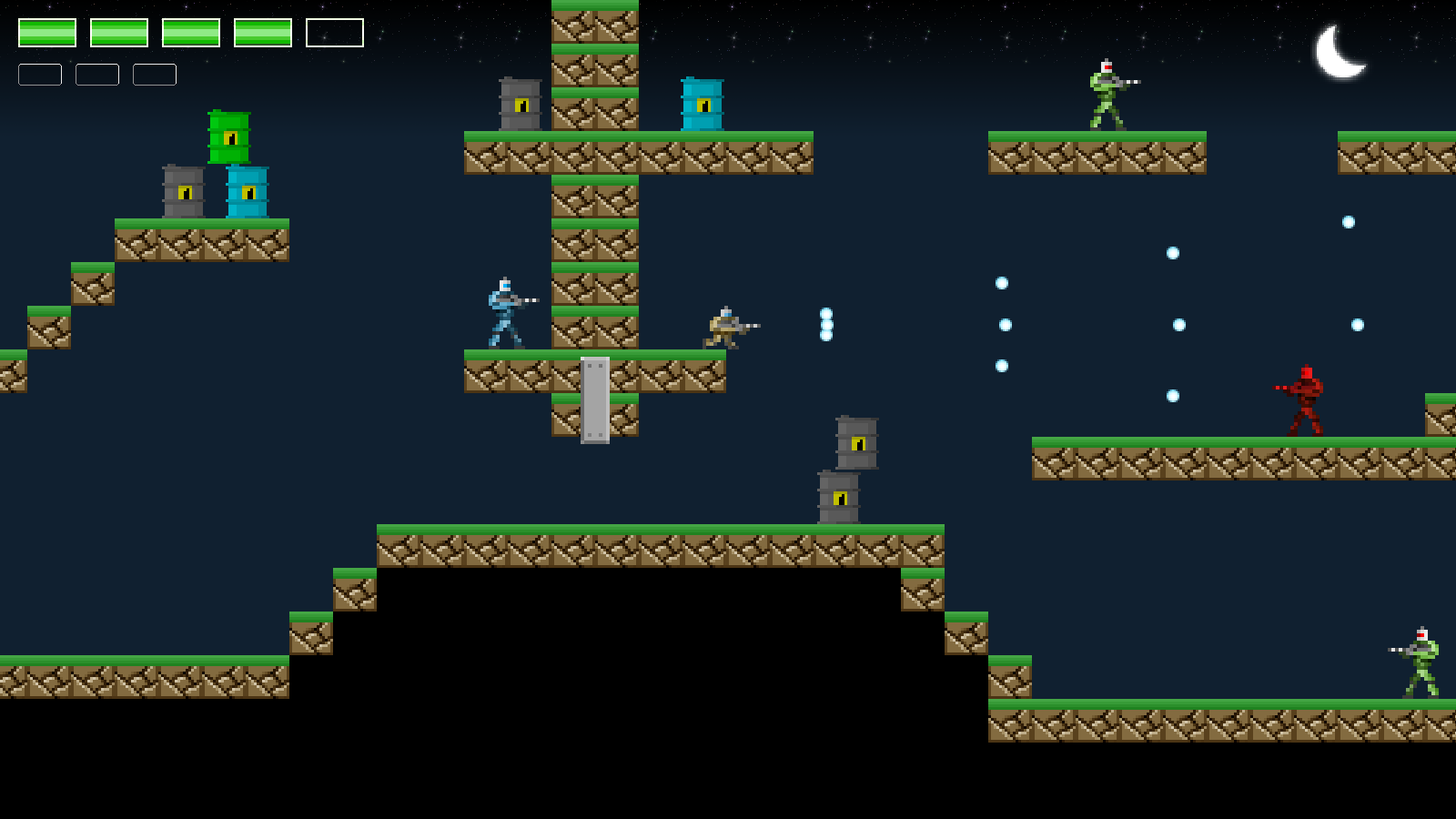 We're first assigning a variable called `x` a value of 20. This is the starting horizontal position of our keycard images. Next, we're setting up a for-loop, up to KEYCARD_MAX. We're then using this to check if our Gunner is carrying a certain keycard, by testing its hasKeycard value at index `i`. As the Gunner's hasKeycard array order and our keycard texture array order mirror our for-loop order, we can render our carried keycards with ease. If hasKeycard at index `i` is 1, we're calling blitAtlasImage, passing in the keycard AtlasImage with the same index, as well as our `x` value. If hasKeycard is 0, we're calling blitAtlasImage and passing through keycardEmpty, to show that we don't have the keycard. After each loop, we're increasing the value of `x` by the width of keycardEmpty, plus 15 pixels for padding. All our keycard images are the same width, so we can use keycardEmpty's width with confidence here. The very last thing to do is enable the creation of the new entities we've added into the game. As with all other entity types, we need only add these into initEntityFactory: