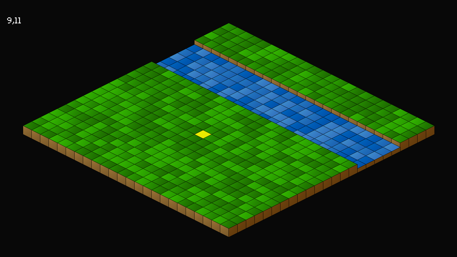 Introduction Now that we can render our map, the next step is to be able to select tiles, using the mouse. In our game, we'll be selecting tiles for the main character to move to. Picking tiles is fairly straightforward and really just requires some reverse calculations from our isometric projection. Extract the archive, run cmake CMakeLists.txt, followed by make, and then use ./isometric02 to run the code. You will see a window open like the one above. Move the mouse cursor around the map to highlight tiles. The tile's x and z values are shown in the top-left. Note that we can only highlight ground tiles (the green ones); moving the cursor over a water tile (blue ones) won't highlight it (but the indexes will still update on screen). Once you're finished, close the window to exit. Inspecting the code Selecting tiles isn't too hard, thankfully, so this is a short part. In fact, things will be getting easier from here on out, compared to part 1. Let's look at structs.h first, where we've updated the World struct: