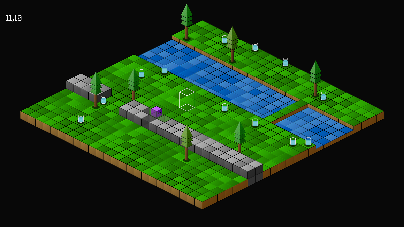 This function is responsible for drawing our wireframe box. Before we begin drawing, we check that Purple Guy isn't currently walking, that the cursor is within map bounds, and that the cursor is over a ground tile or a wall tile. To actually draw our wireframe select box, we're calling addISOObject twice (after performing a check that our cursor is over a valid tile). We're passing over the relevant `x`, `z`, `sx`, and `sy` values, and then each of the tileSelect textures, the first one being drawn on the middle layer (LAYER_MID), and the second being drawn in the foreground layer (LAYER_FOREGROUND). This gives the impression of the wireframe being 3D, and mostly works when hovering over entities. I say mostly, because here is an example of where the sprite-based isometric sorting starts to break down a bit. If one positions the wireframe down from walls, it can be seen that it doesn't quite work the way we expect. This is but a minor error, and one that doesn't detract too much from our game. Most importantly, we don't lose sight of our select box when it goes behind walls. Another part done! The foundations of our game are pretty much there. What we need to do next is load our map data, so that we can start to explore more. We've been standing by that river a bit too long. Purchase The source code for all parts of this tutorial (including assets) is available for purchase: From itch.io It is also available as part of the SDL2 tutorial bundle: | |