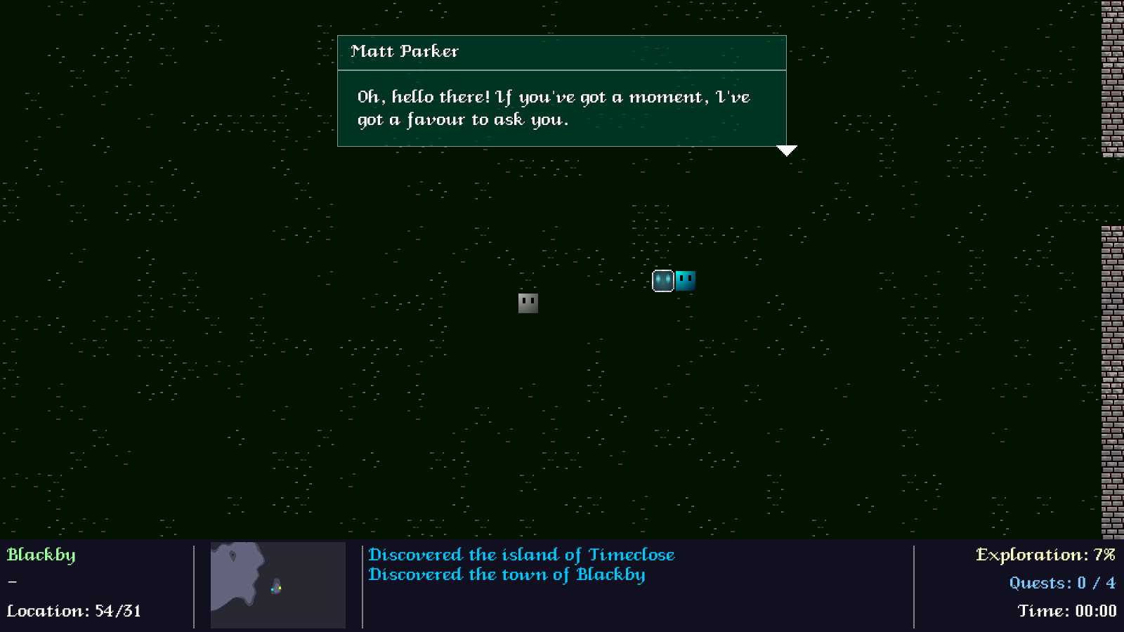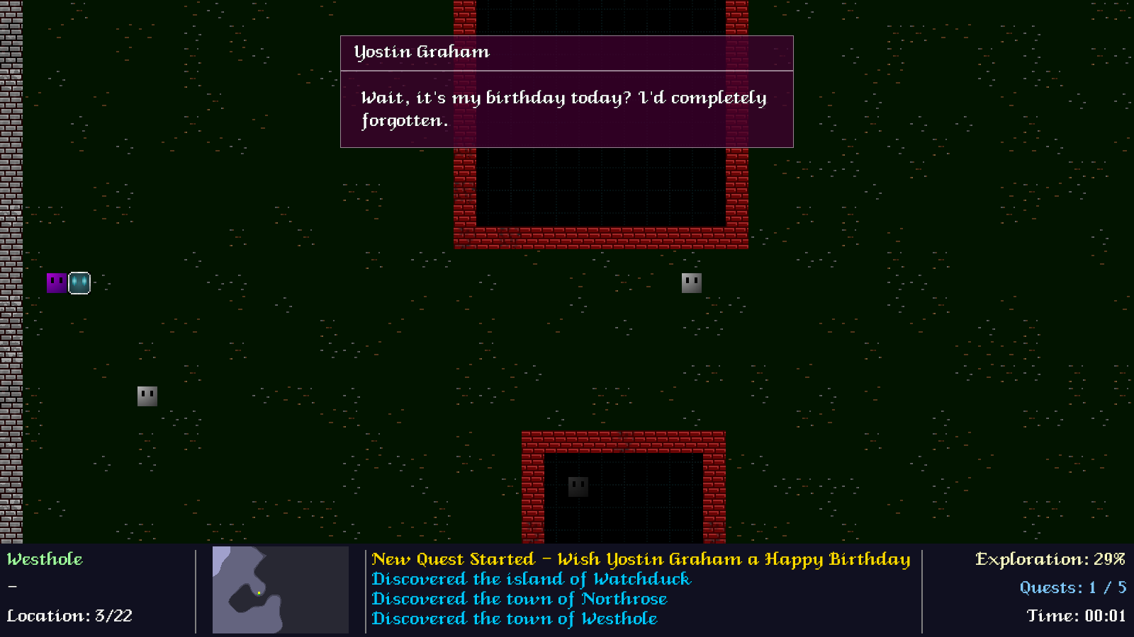 Introduction The final missing piece of our game is the ability to undertake quests. In this part, we're going to put together the ground work for supporting them. This will involve setting up a basic quest, that simply involves interacting with one Resident at the request of another (the quest is simply to wish another Resident a happy birthday). Extract the archive, run cmake CMakeLists.txt, followed by make, and then use ./quest13 to run the code. As before, you can move around with the WASD control scheme. Play the game as normal. Every now again, a Resident will request that you undertake a "quest" to wish another Resident a happy birthday. They will inform you of whom you need to meet, and where. The Quest Log can help you to locate the town where the Resident resides (so long as you've discovered it). In the town itself, the Resident will be swaying left and right on the screen, as a small indication that they are the one you need to talk to to complete the quest. When you're finished, close the window to exit. Inspecting the code This part is, again, a little involved, as there is a lot to add in; we have to add in the quests themselves, update the Resident logic, and also update the Quest Log. Before we get into the code, we'll first look at overview of how our quest system will work. If you've ever played a game like Skyrim or Fallout, you will be aware that the quests there can be seen to be composed of several steps - talk to person, go to location, find object, return to requester. Our quest system will follow a similar design, with a quest object that contains several steps. These steps will be defined as script commands, as we saw in SDL2 Shooter 3. An example of a fully complete script from this part might look like this: INTERACT 8 START_DEMO_QUEST PULSE_ENTITY 15 1 INTERACT 15 PULSE_ENTITY 15 0 MSG_BOX Daniel Larusso;Wait, it's my birthday today? I'd completely forgotten. COMPLETE_QUEST Translated, line by line, this script would mean: - Wait for the player to interact with entity #8. - Setup the "demo quest". - Make entity #15 start to pulse (they will sway back and forth, to draw our attention to them). - Wait for the player to interact with entity #15. - Make entity #15 stop pulsing. - Show a message box, with the speaker as "Daniel Larusso" and the text "Wait, it's my birthday today? I'd completely forgotten." - Mark the quest as complete. We can have as many script lines as we wish, with as many different commands as we want to support. As you can see already, there is huge scope for massive, complex quests, with plenty of options. We'll see more as we dive into the code. So, let's get started. First, we've updated structs.h: