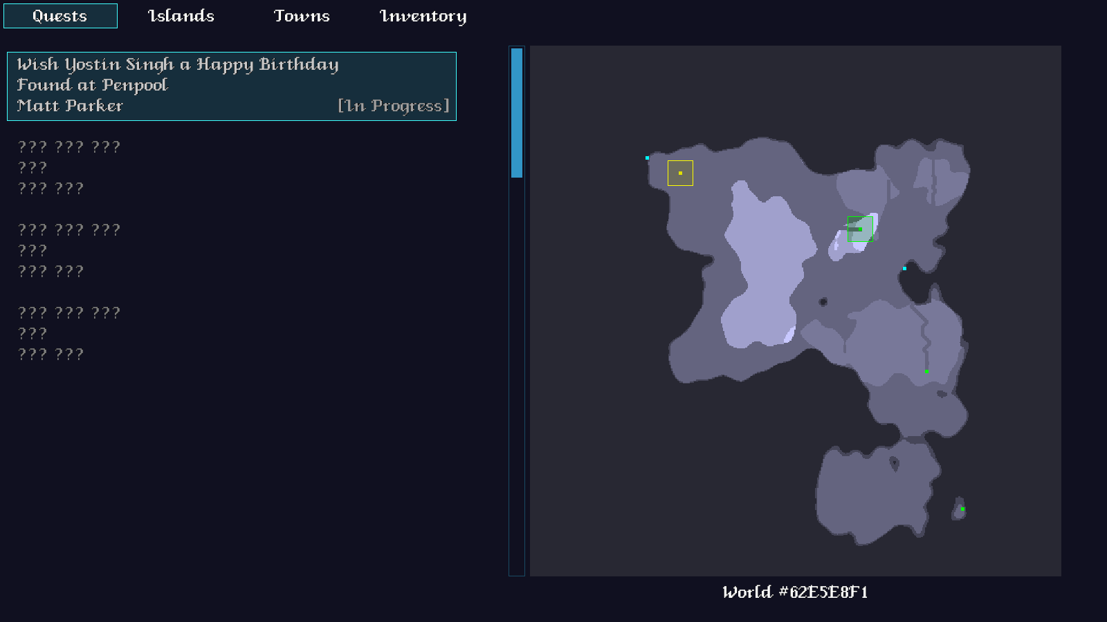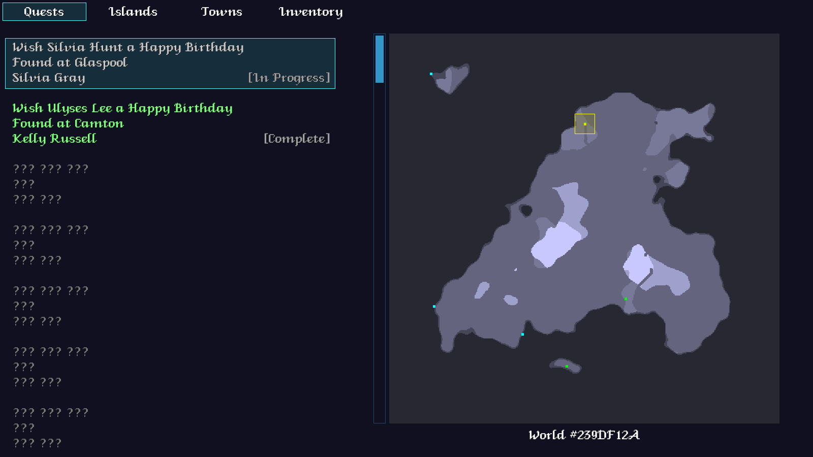 This function is very much like drawTowns and drawIslands, except we're printing a lot more detail about the Quest. If the quest isn't known to us, we're printing a series of question marks. The colour of the text will also change, depending on the quest status (unknown will be grey, incomplete a light grey, and complete a pale green).