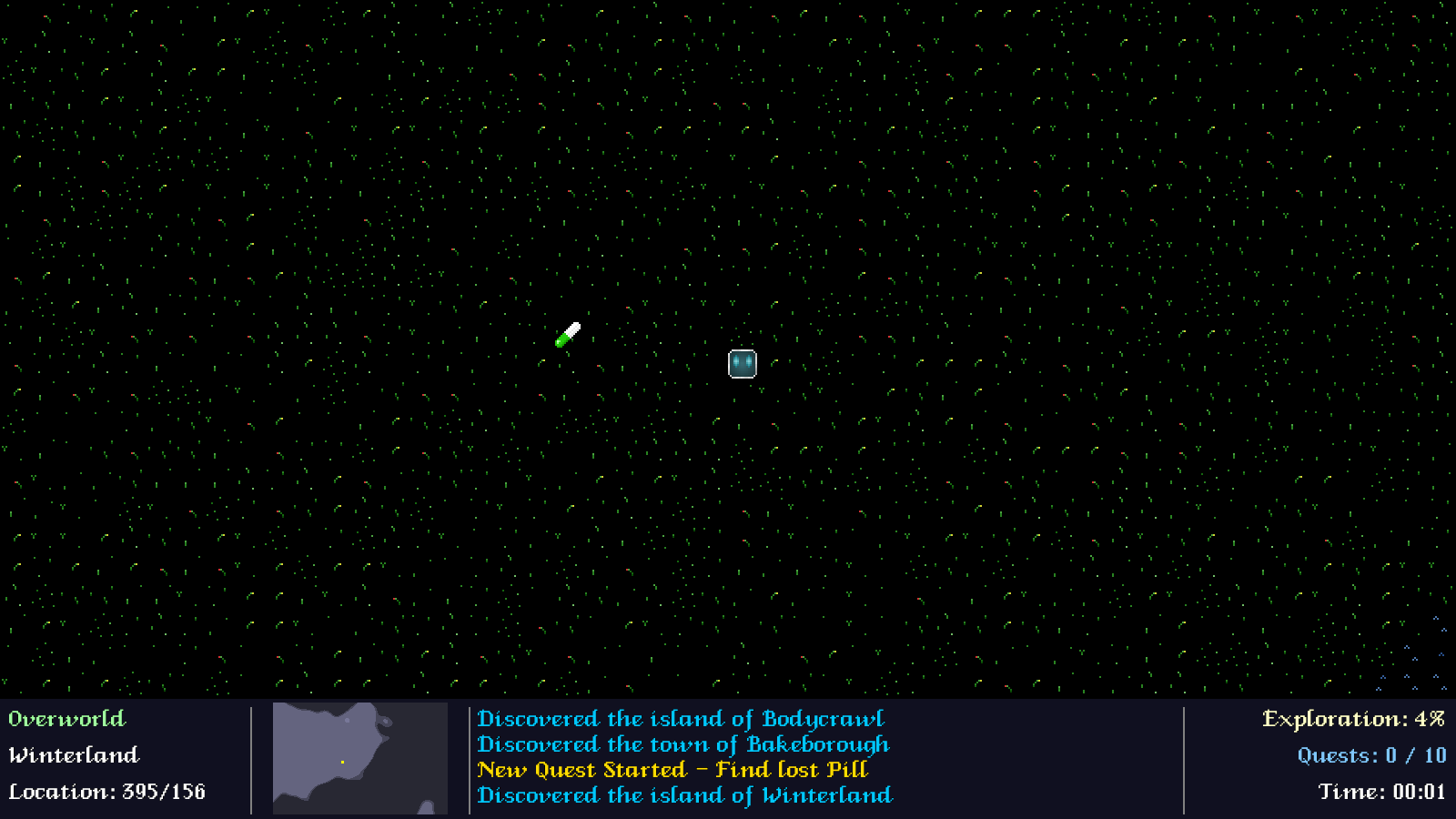Introduction We have our first real quest implemented - a delivery quest. This was a great start, but we should add in a few more. In this part, we're going to look into adding in a fetch quest (a staple of all RPGs). Extract the archive, run cmake CMakeLists.txt, followed by make, and then use ./quest15 to run the code. As before, you can move around with the WASD control scheme. Play the game as normal. Every now again, a Resident will request that you find an item they have misplaced. This might be in a town or on an island, out in the open. The Quest Log can help you to locate the town or island. With the item found, return to the requester to complete the quest. Once done, the item will be removed from your inventory. When you're finished, close the window to exit. Inspecting the code Adding in our fetch quest is very easy, as all the work is done in quests.c; we simply need to support a bunch of new commands, and do some quest setup. So, first over to generateQuest: