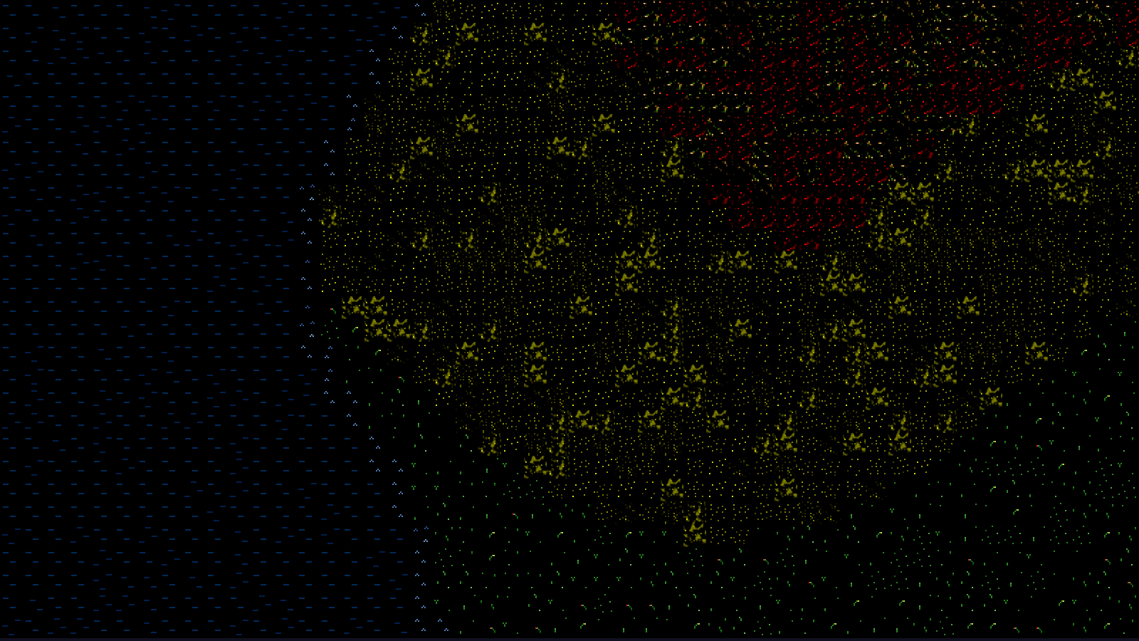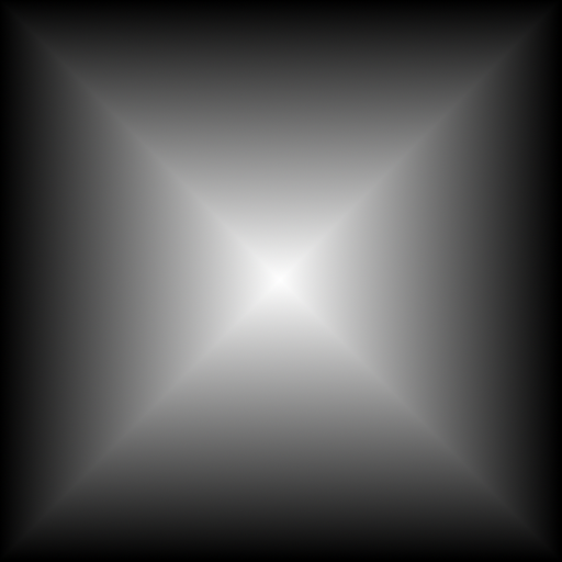 Introduction Our first attempt at world generation went very well. However, it's not quite what we wanted - we want islands, with a major continent in the middle of the map. In order to achieve this, we'll need to make some tweaks to the Perlin noise elevation data. This is much easier than it sounds, as we'll shortly see. Extract the archive, run cmake CMakeLists.txt, followed by make, and then use ./quest02 to run the code. Open the Quest Log (Tab) to view the new world map, which will now look similar to the screenshot above, with a island system in place. You can scroll around the world using the WASD control scheme, as before. When you're finished, close the window to exit. Inspecting the code In order to create an archipelago and add more variety to our overworld map, we need only make changes to the generateOverworldWorker function. The expanded function can be seen further below. Before we get into it, we'll discuss the theory behind everything. We want to ensure that we don't create landmasses near the borders of our world. One might think the easiest thing to do would be to simply set all the values around the edges to 0, thus making them water, but that results in a hard drop off, which isn't want we want; we want the land to naturally create complete landmasses, with shallows, in the middle of the map. In order to achieve this, what we do is lower the elevation of the map as we move away from the centre. Basically, we'll "fade" the edges, by progressively making the values lower. Consider the image below: