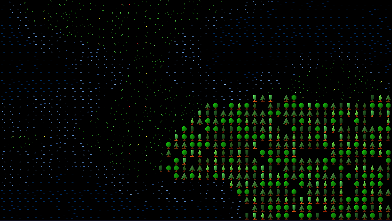First, we're generating a second Perlin noise map, and assigning it to `moisture`. And, as with our elevation data, we're determining the maximum moisture value (maxMoisture) during our map data setup step. With that done, we're performing our "fade" step against the elevation data. Our calculation will only start fading the values halfway out from the centre; we don't want to begin our fade right away, since this will result in far smaller values. We also want to ensure we have one big island on the map. Also note that we're creating a "square" fade, rather than a circular one. A circular one will create a "fish-eye lens" effect, which will look quite unnatural, which we don't want. With our edges nicely faded and our islands now done, we can turn our attention to the decoration step. This is, again, quite straightforward - at the same time as determining our tile type, we'll also inspect the moisture level at the same point. So, before, we were assigning MT_LAND to a tile between between 0.62 and 0.9. Now, we're also testing the moisture value (as `m`). If it's less than 0.3, for example, we'll assign the tile MT_DESERT. Slightly higher and it will be MT_SAVANNAH. MT_LAND follows this, and for high moisture levels, we'll create a forest (MT_FOREST). The results look like this: