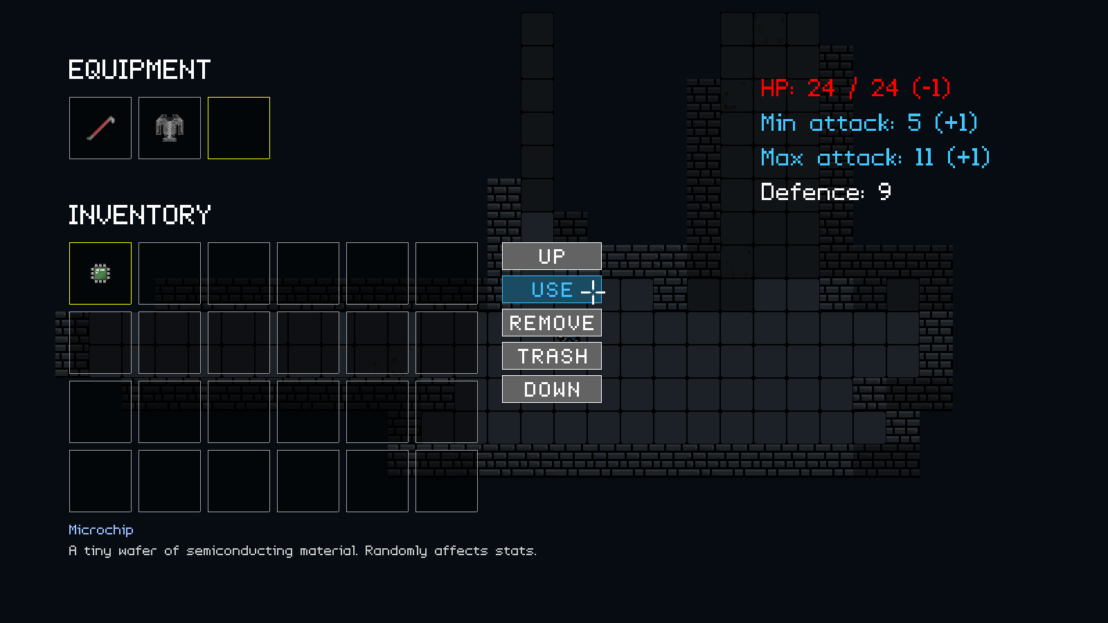 Introduction Something that many RPGs do these days is show you a comparison of stats for the equipment you're using against the equipment you wish to use. In this part, we'll be adding such a feature to the inventory screen, so we can see what benefits, if any, adding armour, weapons, and microchips have on our stats. Extract the archive, run cmake CMakeLists.txt, followed by make, and then use ./rogue10 to run the code. You will see a window open like the one above, showing our main character in a dungeon environment. Use the same controls as before to move around and open the inventory. Pick up the items as you find them. Equip and remove the items as you please. Notice how the comparison is displayed when clicking on an item in the inventory and also when selecting it in the equipment box. When clicking on the item in the equipment box, we're displaying the effect of removing the item, rather than adding it. Once you're finished, close the window to exit. Inspecting the code This part is quite short, as comparing the item stats is pretty straightforward; we've only had to make changes to two files to do so. We'll start with player.c, where we've updated two functions. initPlayer comes first: