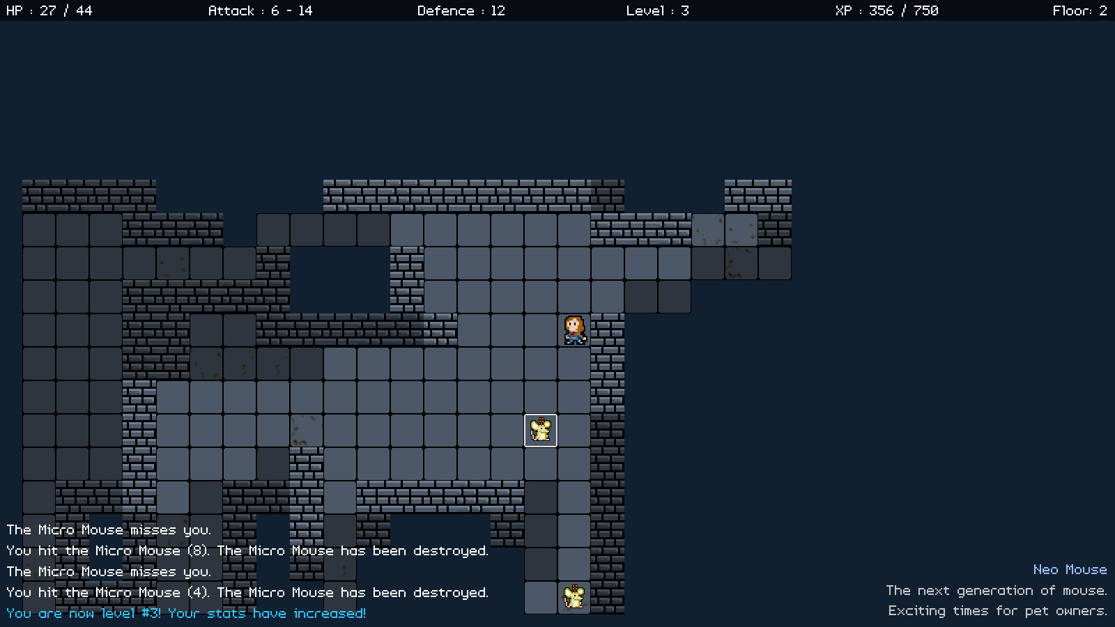 Introduction Now that we can traverse floors, it's about time that we introduced some more Monsters (just variations on the Micro Mouse, to be honest) and equipment into the game. This part will focus on introducing those things, and also offering more powerful monsters and equipment as we rise through the floors. Extract the archive, run cmake CMakeLists.txt, followed by make, and then use ./rogue13 to run the code. You will see a window open displaying the player character in a small room, with just a stair case (leading up). Play the game as normal and battle the new monsters as you encounter them. New weapons, armour, and microchips can be equipped as before. Once you're finished, close the window to exit. Inspecting the code Starting out, we've made an update to defs.h: