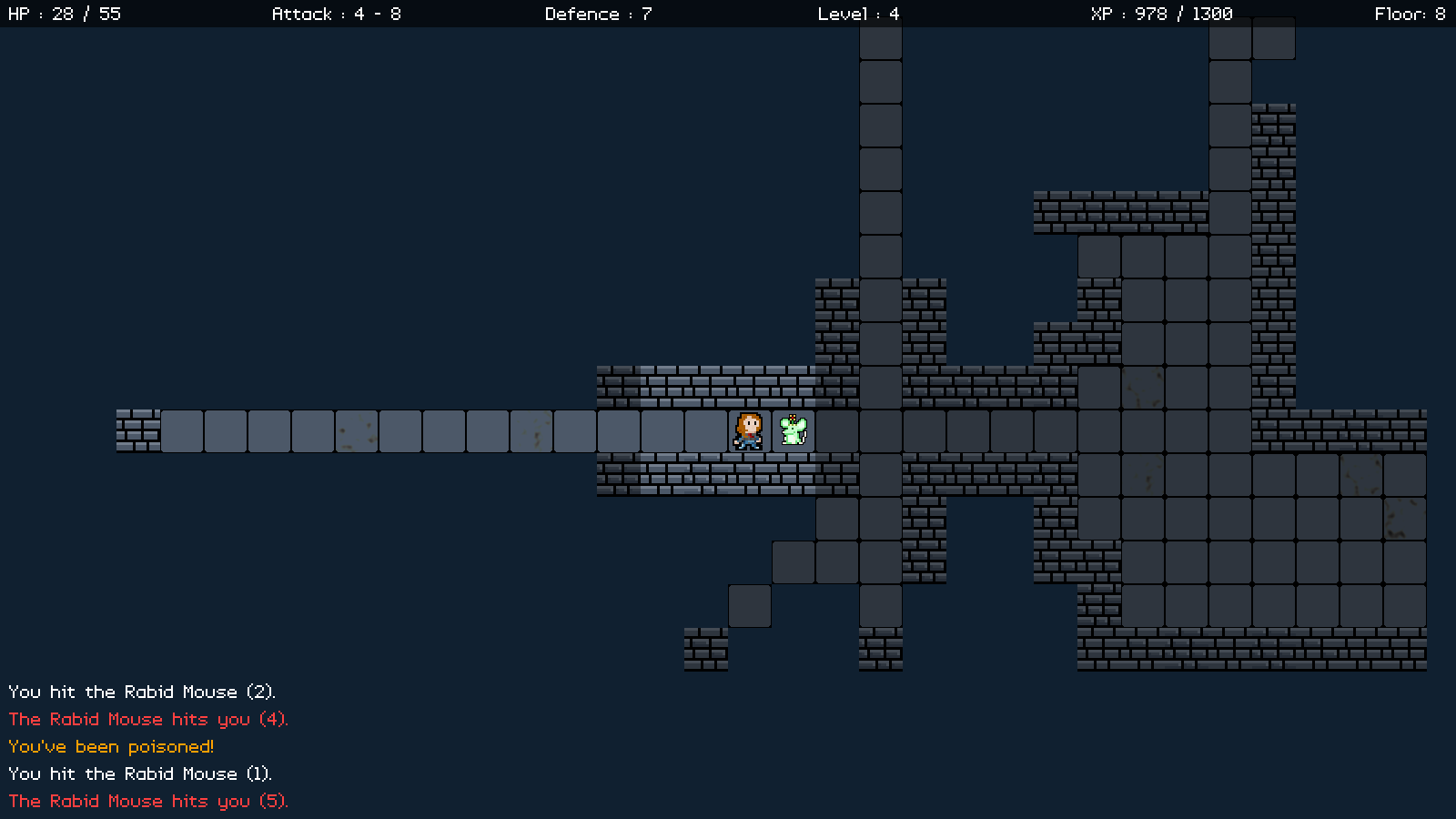 Extract the archive, run cmake CMakeLists.txt, followed by make, and then use ./rogue16 to run the code. You will see a window open displaying the player character in a small room, with just a stair case (leading up). Play the game as normal. It might take a while to reach the mice that can cause these effects, since only the higher level mice (Tough Mouse, Rabid Mouse, and Meta Mouse) can affect the player. When stunned, the player's turn will be skipped. When confused, the player will walk randomly. When poisoned, the player will lose 1 hit point per turn, although it will never fall below 1. It can be cured by using a vial of antivenom. Once you're finished, close the window to exit.