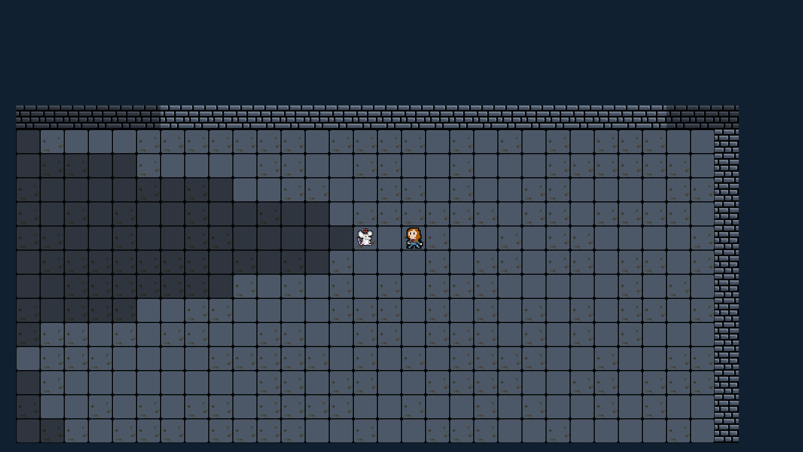 Introduction We're now ready to add in our first monster. To begin with, our monster, a Micro Mouse, will be competely static, not moving or attacking. One could almost consider it a wall. However, we're going to use this opportunity to lay the ground work for fully supporting our monsters fully later down the line. Extract the archive, run cmake CMakeLists.txt, followed by make, and then use ./rogue02 to run the code. You will see a window open like the one above, showing our main character in a dungeon environment. Use the same controls as before to move around. Notice how the mouse blocks not only our movement, but also our line of sight. The mouse's placement is random each time a dungeon is generated. Once you're finished, close the window to exit. Inspecting the code Adding our static mouse is quite simple, due to everything we prepared in part one. To begin with, let's update defs.h: