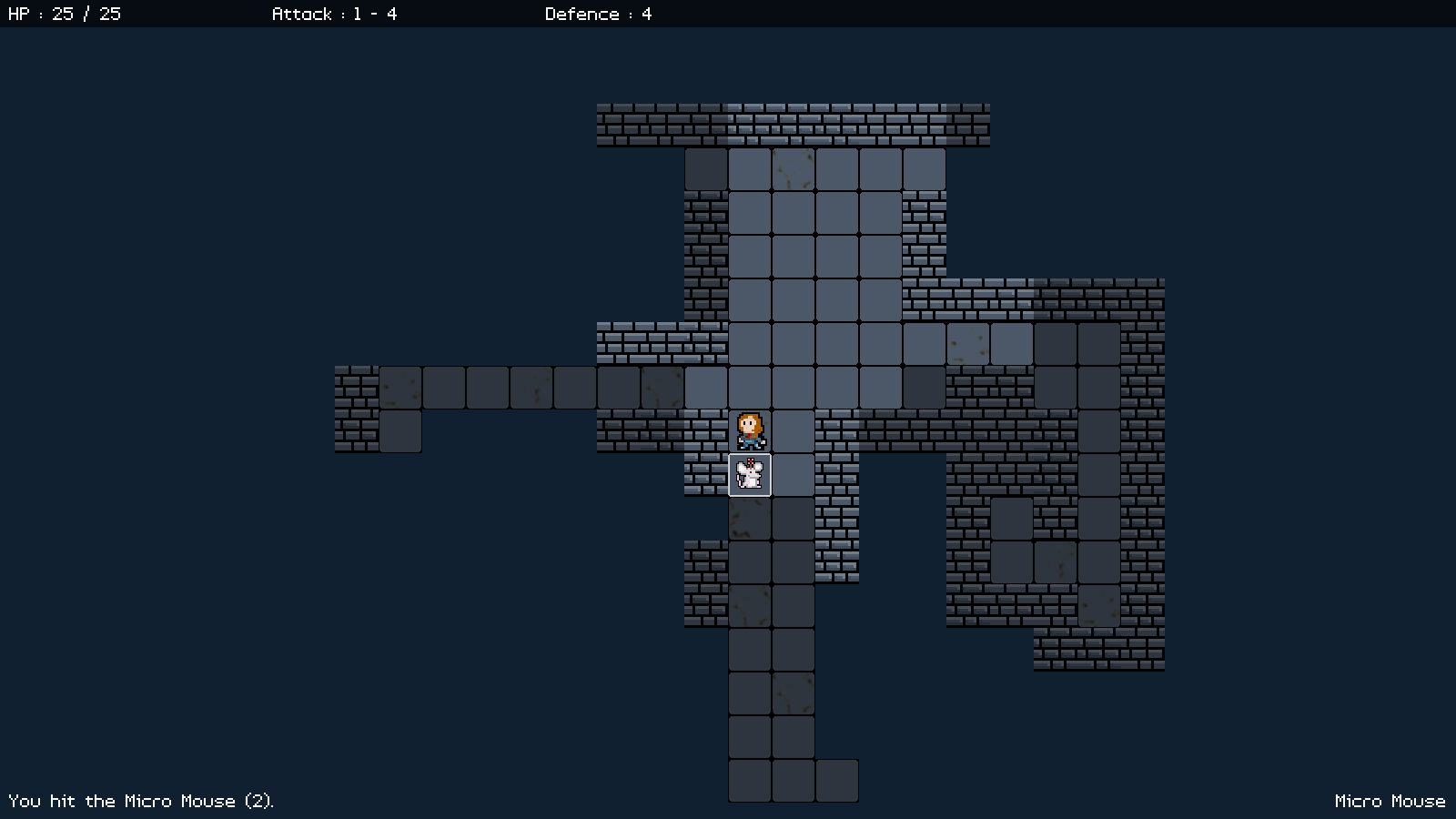 Introduction At this point, it would be good to introduce a better HUD, so we can see, for example, how many hit points we have remaining, and also display some useful information such as what is happening in battle. We'll do just that in this part. Extract the archive, run cmake CMakeLists.txt, followed by make, and then use ./rogue04 to run the code. You will see a window open like the one above, showing our main character in a dungeon environment. Use the same controls as before to move around. Battle the Micro Mouse when you find it. You'll see messages about the battle in the bottom left corner of the screen. Additionally, you can use the mouse to highlight the tiles on the map. Placing the tile select over an Entity (either the player or the mouse) will display their name in the bottom right-hand corner of the screen. Once you're finished, close the window to exit. Inspecting the code Introducing our HUD isn't going to be a difficult task, as we're really just rendering some text. We'll start by the updates to defs.h: