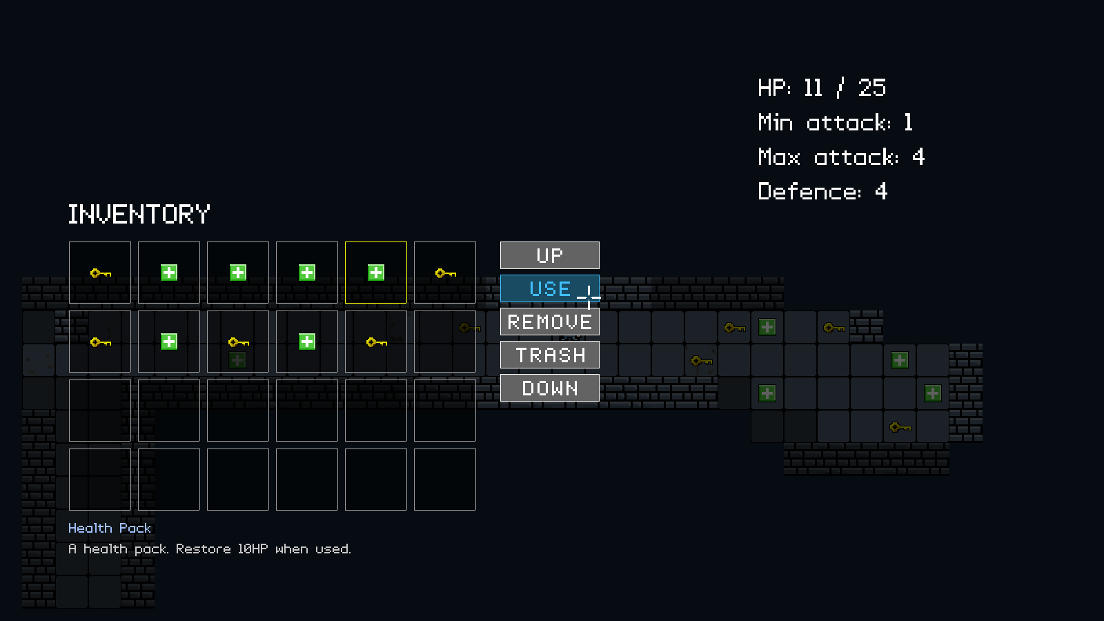 Introduction Now that we can pick up items and store them in our inventory, it would be good to add in the ability to use them, as well as manipulate our inventory. In this part, we'll do just that. We've introduced health packs to be picked up, as well as keys, and we have scattered 5 each through our small dungeon. For the purpose of demonstrating the health pack usage, we've started the player with 1 hit point. This part will be quite long, since UI work is quite intensive. Extract the archive, run cmake CMakeLists.txt, followed by make, and then use ./rogue08 to run the code. You will see a window open like the one above, showing our main character in a dungeon environment. Use the same controls as before to move around and open the inventory. Pick up the items as you find them. Health packs can be used to restore health by opening the inventory, selecting a health pack with the mouse, and then clicking on the Use button. This button does nothing when used with a key. The inventory can be scrolled up and down by clicking the Up and Down buttons. Items can also be destroyed by clicking on the Trash button when they are selected. Note that the Remove button currently does nothing. So as to keep the focus on items, there are no monsters to be found in this part. Once you're finished, close the window to exit. Inspecting the code As already stated, this part will be quite long, so we'll dive straight in. Start with the update to defs.h:
