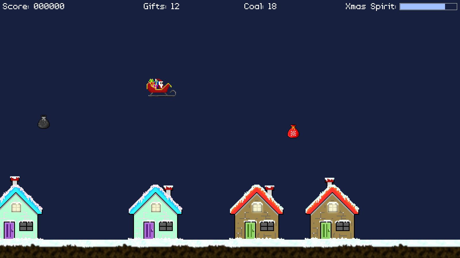 This function will decrease the value of objectSpawnTimer, and then attempt to create an object when the value falls to 0 or less. To create our objects (right now, we only have sacks), we're testing a random of 100 (assigned to a variable called `n`). If it's less than 15, we'll call initGiftSack. If it's less than 30, we'll called initCoalSack. Any other number will be ignored, for now. Finally, we reset objectSpawnTimer back to a value between 5 and 9 seconds. And that's all there is to it! Our game is now fairer and players can enjoy it for much longer. How long they can keep going will depend on their skill in delivering gifts as the game speeds up, and also on the random chance of gift sacks appearing. Otherwise, one could argue that our game is now complete. But we don't want to leave it here, as there's so much more we can do to make things interesting. You might recall that we said our elves were responsible for teleporting in the sacks for Santa, but that their magic has gone slightly wrong and had enchanted the nearby snowmen? Well, in the next part we're going to introduce the first of these snowmen, who will act as hazards that the player must avoid. Purchase The source code for all parts of this tutorial (including assets) is available for purchase, as part of the SDL2 tutorials bundle: From itch.io |