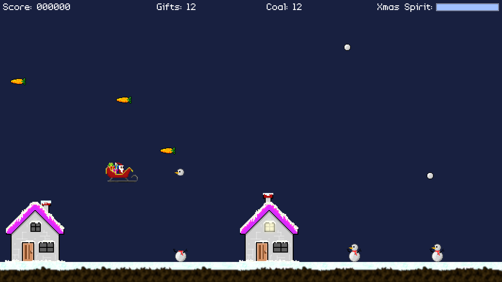 Introduction Having added in our first enchanted snowman, we're ready to add in the second. The first snowman tossed a snowball up into the air, while this second one is going to toss his head! Not only that, but the fiend is going to be shooting magic carrots at Santa, in a bid to disrupt Christmas. Just as with the snowball, a hit will result in an immediate game over. Extract the archive, run cmake CMakeLists.txt, followed by make, and then use ./santa12 to run the code. Press Space to play. Use the same controls as before. As you play, enchanted snowmen will appear, tossing snowballs into the air, as well as their own heads, shooting carrots at you. Avoid the snowballs, heads, and carrots, and continue to deliver gifts and collect sacks. The game will continue for as long as you are able to maintain your Xmas Spirit (and don't crash into a house or other hazard). When you're finished, close the window to exit. Inspecting the code Adding in this new "enemy" is extremely easy, as they are similiar to the previous one in several aspects! In fact, you're going to feel a sense of déjà vu as we go through the code for our second enchanted snowman. Let's dive in. Starting with defs.h: