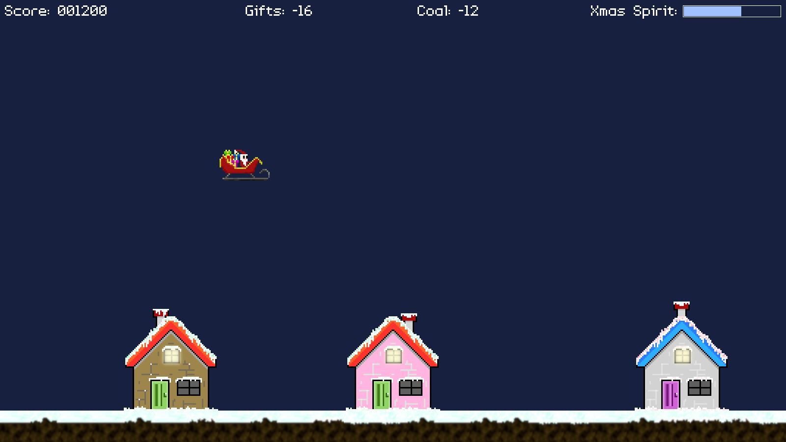 For the most part, this is rather simple - we're just rendering the text of our score, gifts, and coal at various points across the top of the screen. This happens to be the reason why we're limiting Santa to 50 pixels on the vertical, since we don't want him to enter the HUD area. When it comes to our Xmas Spirit, we're drawing a white rectangle of XMAS_SPIRIT_BAR_WIDTH length, and then drawing another rectangle that will have a width based on the percentage of Xmas Spirit we have remaining (using our local xmasSpirit, divided by MAX_XMAS_SPIRIT - for a value between 0 and 1 - and multiplying our width by the result). Using the local xmasSpirit, which is a double, this will cause the bar to smoothly decrease in length, rather than immediately jump to the new value. To make the bar shudder, we're drawing the bar at a vertical position (`y`) that will be adjusted by the sine of xmaxSpiritBarShudder, multiplied by 5. When it comes to choosing our bar's colour (`r`, `g`, `b`), we're setting a light blue colour, then testing if our xmasSpirit is low ( <= 1) and whether the modulo of our xmaxSpiritBarWarningTimer is within half a second, and altering the colour to white, before rendering the bar. All pretty simple at the end of the day. Nothing we've not seen before, and just some added glitz. Our HUD is done, so let's look at the other little tweaks we've made. First to player.c, where we've updated dropGift:
