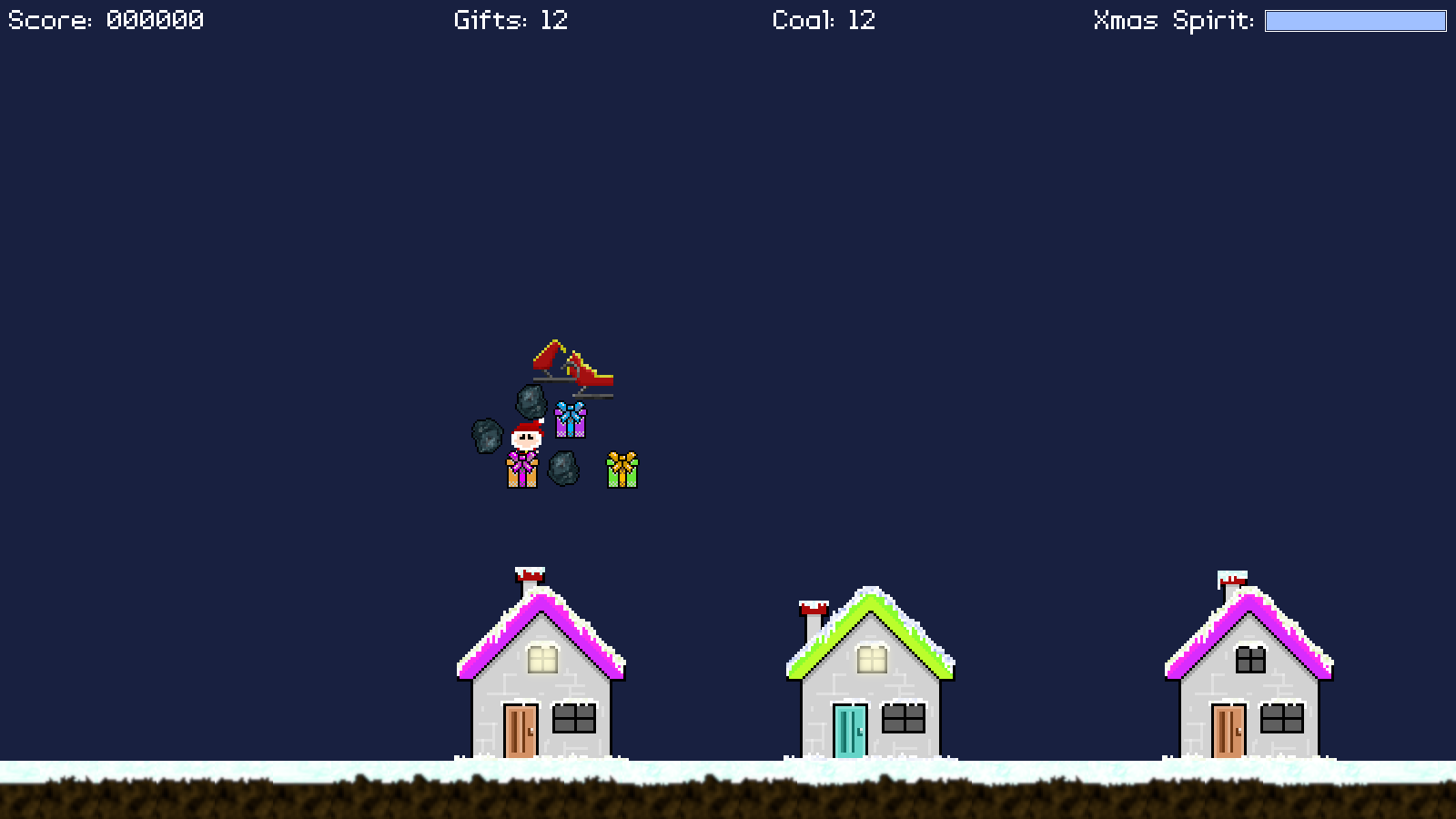 Introduction It's time to implement the first part of our game loop. In this part and the next, we're going to implement our game over sequence, and our restart logic (including highscore display). Both these parts will be somewhat unfair, since there is no way to earn more gifts and coal, meaning that failure will be swift and inevitable. Extract the archive, run cmake CMakeLists.txt, followed by make, and then use ./santa08 to run the code. You will see a window open like the one above, with the scene moving from right to left. Use the same controls as before. You have limited coal and gifts to make deliveries, with no means of gaining more. This will mean that eventually your Xmas Spirit will run out, due to missed deliveries, and the game will end. Additionally, if Santa collides with either a house or a chimney, the sleigh will explode and the game will end. The game doesn't restart upon a game over (Xmas Cancelled), so when you're finished close the window to exit. Inspecting the code There's quite a lot that we need to add for this first part, since we're handling the destruction of the sleigh, the loss of Xmas Spirit, and lots of misc. other pieces. We'll start, as is usual, with defs.h:
