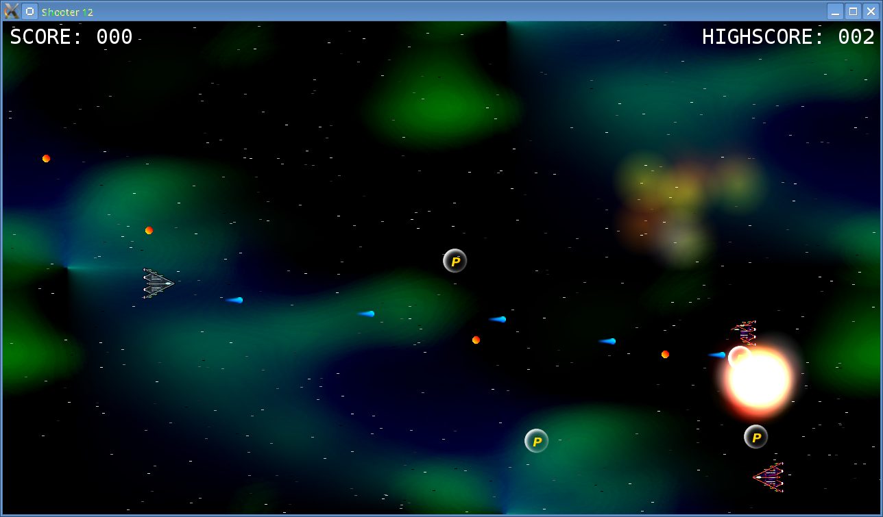 Introduction Note: this tutorial builds upon the ones that came before it. If you aren't familiar with the previous tutorials in this series you should read those first. We can shoot the enemies to destroy them, but right now they just vanish. That's no fun. How about we make them explode, instead? Extract the archive, run cmake CMakeLists.txt, followed by make to build. Once compiling is finished type ./shooter12 to run the code. A 1280 x 720 window will open, with a colorful background. A spaceship sprite will also be shown, as in the screenshot above. The ship can now be moved using the arrow keys. Up, down, left, and right will move the ship in the respective directions. You can also fire by holding down the left control key. Enemies (basically red versions of the player's ship) will spawn from the right and move to the left. Shoot enemies to destroy them. Enemies can fire back, so you should avoid their shots. Score points by collect points pods released from destroyed enemy ships. Close the window by clicking on the window's close button. Inspecting the code To make the game a little more challenging, we're going to make it so that the player only gains points by collects points pods that are released by destroying enemy ships. The means that the player will be forced to negotiate enemy fire while hunting them down. Let's begin with structs.h: