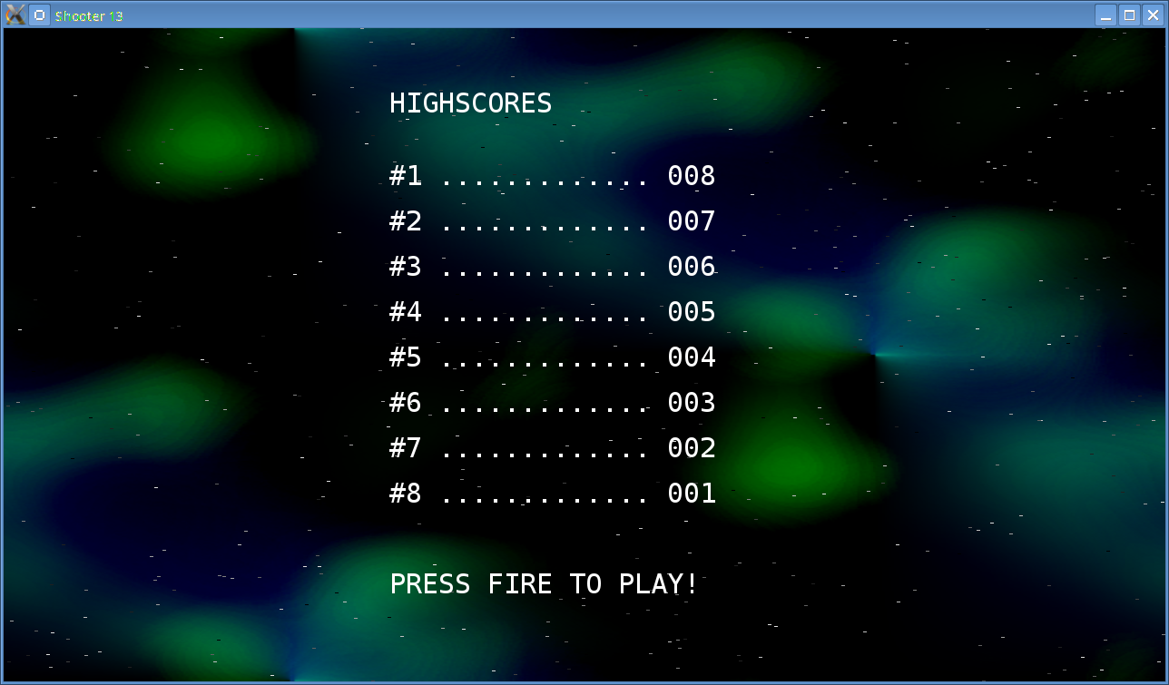 Introduction Note: this tutorial builds upon the ones that came before it. If you aren't familiar with the previous tutorials in this series you should read those first. We must now collect score pods to earn points, making the game a little more tricky. Wouldn't it be fun if we had a highscore table? This part of the tutorial will do just that.Extract the archive, run cmake CMakeLists.txt, followed by make to build. Once compiling is finished type ./shooter13 to run the code. A 1280 x 720 window will open, with a colorful background. A highscore table is displayed, as in the screenshot above. Press the left control key to start. A spaceship sprite will also be shown. The ship can now be moved using the arrow keys. Up, down, left, and right will move the ship in the respective directions. You can also fire by holding down the left control key. Enemies (basically red versions of the player's ship) will spawn from the right and move to the left. Shoot enemies to destroy them. Enemies can fire back, so you should avoid their shots. Score points by collect points pods released from destroyed enemy ships. The highscore table is shown upon the player's death and the game can be played again. Close the window by clicking on the window's close button. Inspecting the code We've added a several new pieces of code, including a new compilation unit. We'll start with defs.h and structs.h. Note - there's been some refactoring done to the code, but we'll cover all this at the end. For now, let's start with everything related to the highscore table. defs.h has a simple update: