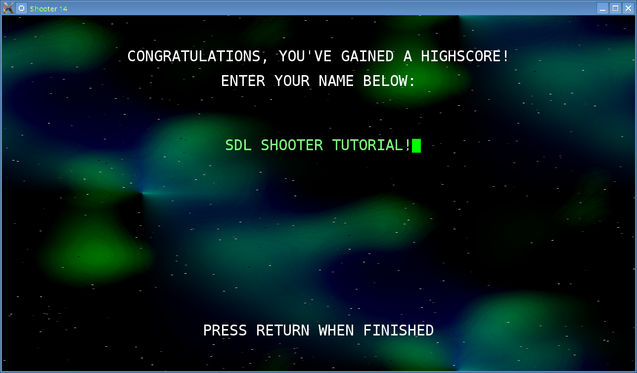 Introduction Note: this tutorial builds upon the ones that came before it. If you aren't familiar with the previous tutorials in this series you should read those first. We must now collect score pods to earn points, making the game a little more tricky. Wouldn't it be fun if we had a highscore table? This part of the tutorial will do just that. Extract the archive, run cmake CMakeLists.txt, followed by make to build. Once compiling is finished type ./shooter14 to run the code. A 1280 x 720 window will open, with a colorful background. A highscore table is displayed, as in the screenshot above. Press the left control key to start. A spaceship sprite will also be shown. The ship can now be moved using the arrow keys. Up, down, left, and right will move the ship in the respective directions. You can also fire by holding down the left control key. Enemies (basically red versions of the player's ship) will spawn from the right and move to the left. Shoot enemies to destroy them. Enemies can fire back, so you should avoid their shots. Score points by collect points pods released from destroyed enemy ships. The highscore table is shown upon the player's death. If the player has earned a highscore, they will be prompted to enter their name. The highscore table is then shown and the game can be played again. Close the window by clicking on the window's close button. Inspecting the code In our last tutorial, we added a highscore table. Now we've added the ability for the player to type in their name when they gain enough points to earn a place. Before we get to that, let's take a look at the updates we've made to the text drawing function, to mitigate any confusion later. First, we've updated defs.h: