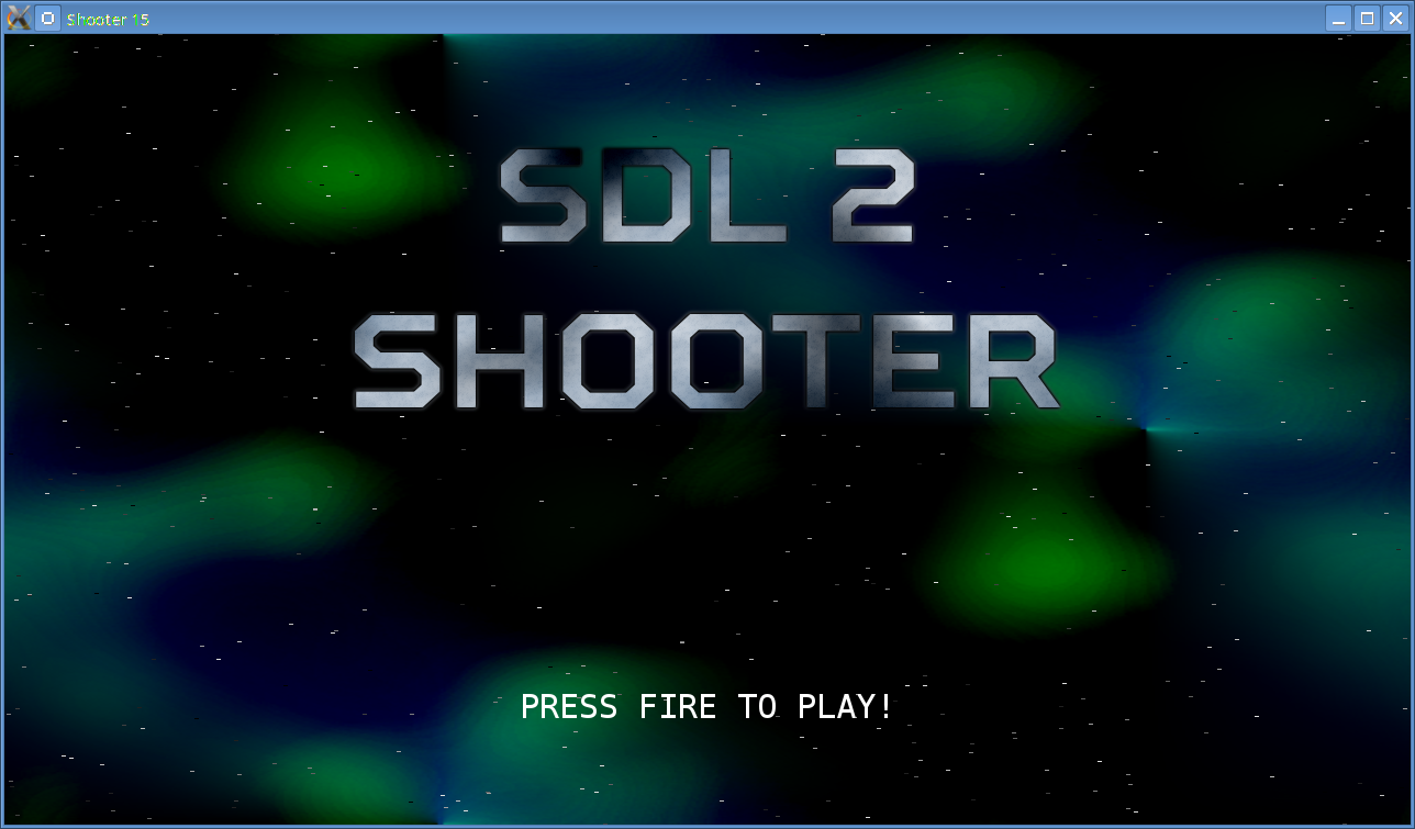 Introduction Note: this tutorial builds upon the ones that came before it. If you aren't familiar with the previous tutorials in this series you should read those first. Our game is missing just one thing: a title screen. In this tutorial, we'll set one up and add some finishing touches to our game. Extract the archive, run cmake CMakeLists.txt, followed by make to build. Once compiling is finished type ./shooter15 to run the code. A 1280 x 720 window will open, with a colorful background. The title screen will be displayed, as in the screenshot above. Press the left control key to start. A spaceship sprite will also be shown. The ship can now be moved using the arrow keys. Up, down, left, and right will move the ship in the respective directions. You can also fire by holding down the left control key. Enemies (basically red versions of the player's ship) will spawn from the right and move to the left. Shoot enemies to destroy them. Enemies can fire back, so you should avoid their shots. Score points by collect points pods released from destroyed enemy ships. The highscore table is shown upon the player's death. If the player has earned a highscore, they will be prompted to enter their name. The highscore table is then shown and the game can be played again. Close the window by clicking on the window's close button. Inspecting the code The last few things that we've added to our code is the title screen and some tweaks. Not a great number of updates, so this final part of the tutorial will be quite short (and thankfully our final 10% didn't take 90% of the time!). First, let's look at the new title.c file. It contains just four functions. We'll go through them in order: