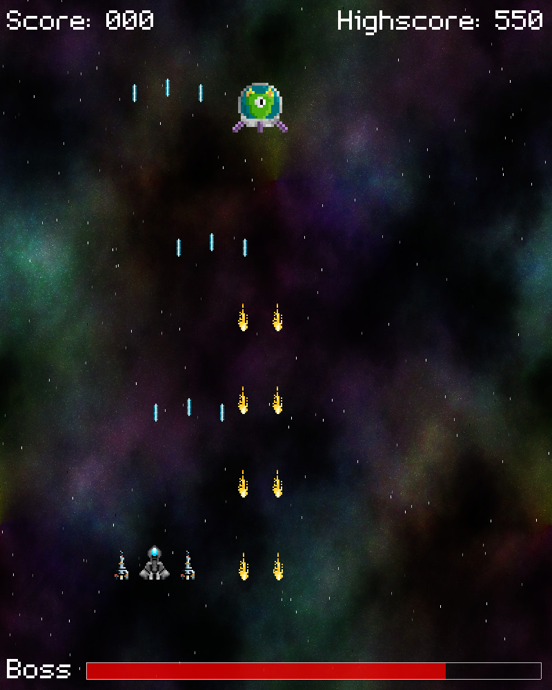 For this, we're extracting the Boss data from Stage's `boss` field. We're then working out the percentage of health the boss has left, by dividing the entity's `health` by the Boss's maxHealth. Both fields are ints, so we first multiply the boss health by 1.0, allowing us to work with decimals, and assigning the result of this to `w`. This will mean that `w` has a value of between 0.0 and 1.0 (a normalized percentage). Next, we're multiplying `w` by BOSS_BAR_LENGTH (defined as SCREEN_WIDTH - 140). Ultimatley, this means that `w` will be larger while the boss has more health. We're then drawing the "Boss" text, and two rectangles, using drawRect and drawOutlineRect. drawRect is a red bar, with a width of `w`, while drawOutlineRect is a white outline with a length of BOSS_BAR_LENGTH. What we're left with is a red bar that shrinks in length as the boss losses health, contained in a white bar that shows the maximum. Both bars are drawn in the same location, with the outline containing the red bar. That's our bosses done! What we need now is more power-ups, in order to battle them. In our next part, we'll update the power-up pod so that it rotates between available power-ups, including offering a shield and a mobile drone. We'll also offer the chance to increase the speed of our fighter and the fire rate of our guns. Mind, we need to be careful that our sidearms and shields aren't destroyed by enemy fire ... Purchase The source code for all parts of this tutorial (including assets) is available for purchase: From itch.io It is also available as part of the SDL2 tutorial bundle: |