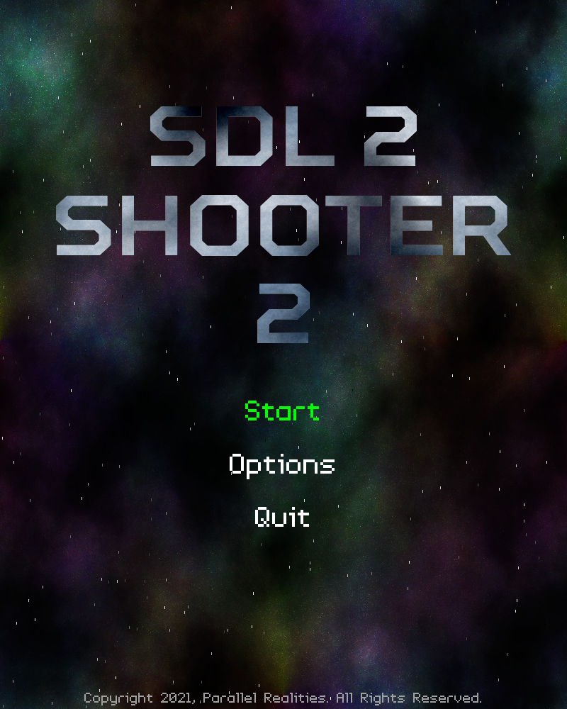 Introduction Our main game is done, meaning all we need to do is throw in the finishing touches (and make a few gameplay tweaks). In this final part, we'll be looking at what we've added to complete the experience. Note that due to adding the widget system, there have been elements of refactoring. We'll not be looking at the widgets, the music, or the sound, as these have been seen in previous tutorials and to cover them all here would mean a very long final part. Instead, we'll be focusing on the specifics of this tutorial: the title screen, the highscore table, and the save routine. Extract the archive, run cmake CMakeLists.txt, followed by make, and then use ./shooter2-09 to run the code. You will see a window open like the one above. Use the Up and Down arrow keys with Space or Return to navigate the menu. Use the Left and Right keys to change the volume values of sound and music, when the widgets are highlighted. To change a control, highlight the control then press Return or Space, followed by the key you wish to use for the control. Pressing Escape will cancel the change. Play the game as usual, and enter a highscore if you manage to get one. Games are saved to the file save.json in the same directory as the game itself. When you're finished, close the window to exit or select Exit from the title screen. Inspecting the code Even with skipping over the widgets, sound, and music, there is still quite a lot to get through in this final part. Let's look at the changes to defs.h first: