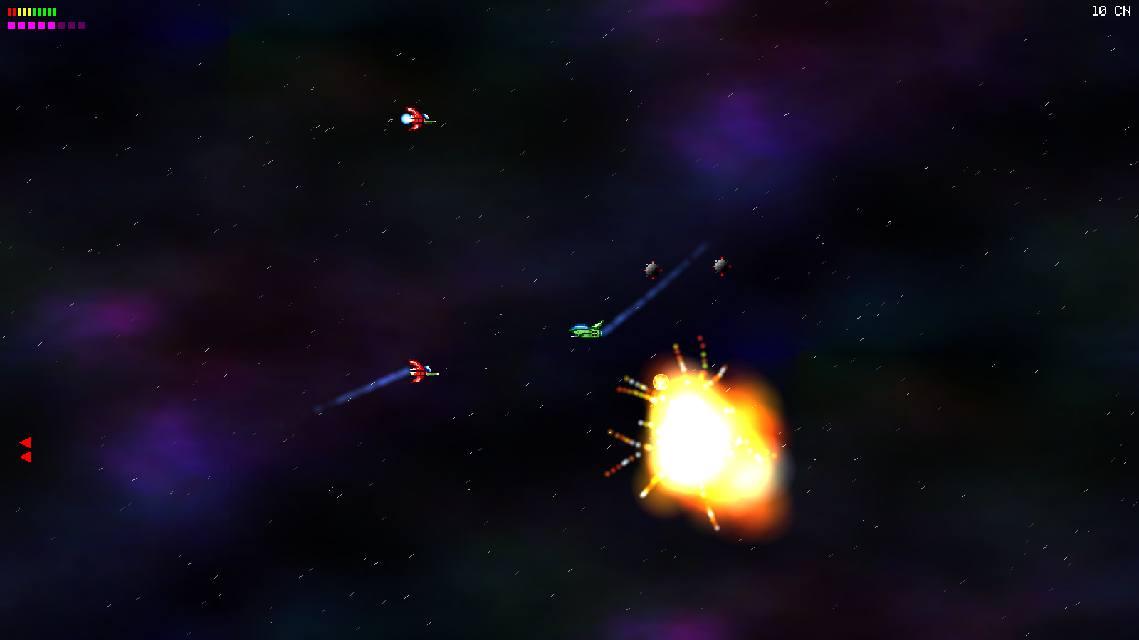 Introduction Our final secondary weapon is a mine. It's yet another weapon that is easy to implement, and also one with unique properties compared to the others. When deployed, our mines will move towards the nearest enemy (at a slow speed), exploding with an area effect when they are close. Thus, this weapon can affect multiple enemies at once. Extract the archive, run cmake CMakeLists.txt, followed by make, and then use ./shooter3-10 to run the code. You will see a window open like the one above. Use the WASD control scheme to move the fighter around. Hold J to fire your main guns. Press I to deploy a mine. Play the game as normal. Deploying mines consumes ammo. Luring enemies into proximity of the mines will cause them to detonate, dealing them damage. The explosions cannot hurt the player. Once you're finished, close the window to exit. Inspecting the code As already stated, adding in our mines is a simple task, with only a few tweaks needed, as well as the logic updates. As always, let's first turn to defs.h: