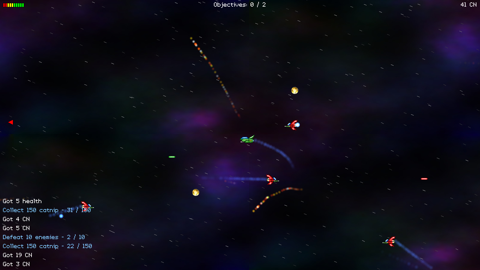 Introduction It's time to introduce our objectives system into our game. Each of our missions will feature one of more objectives that need to be completed, and so we need a system to track them. Our objectives system will be simple to understand and implement. No major complexity will be found here! Extract the archive, run cmake CMakeLists.txt, followed by make, and then use ./shooter3-12 to run the code. You will see a window open like the one above. Use the WASD control scheme to move the fighter around. Hold J to fire your main guns. Play the game as normal. The goal is to destroy 10 enemies fighters and collect 150 catnip (total value) that is dropped by them. Take note of the objective update messages. When all objectives are met, the Mission Complete message will be displayed in green (the game will continue playing, however). Once you're finished, close the window to exit. Inspecting the code Adding in our objectives isn't a difficult task, at all, and the system we're going to build will come with a lot of flexability. At the end of the day, our objectives system is just a list of ids and values. Let's get into the code. We'll start with defs.h, where we've added a new enum: