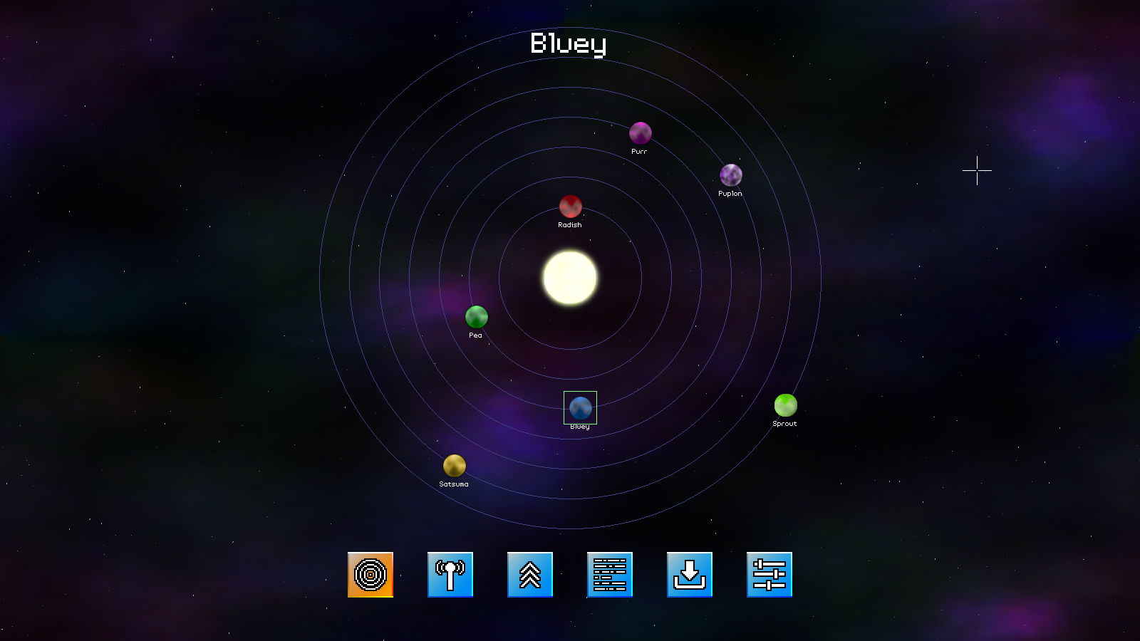 Introduction With our base intermission support done, we can begin implementing the various sections. We're going to start with the planets section. This will display a bunch of planets, orbiting a central star. The planets themselves will be labelled and can be clicked on by the player. Later, missions will be connected to the planets. For now, we're just going to deal with the display, motion, and interaction. Extract the archive, run cmake CMakeLists.txt, followed by make, and then use ./shooter3-15 to run the code. You will see a window open like the one above. Use the mouse to control the cursor. Click on a planet to select it, resulting in a green pulsing box outlining it. Its name will be shown at the top of the screen, in a larger font. There's nothing more to do for now. Once you're finished, close the window to exit. Inspecting the code Those who played Project: Starfighter will recognise this screen (and some other screens to come!). This screen will be where we select planets, to play missions. Clicking on a mission in future will affect the comms icon, and whether it can be selected. This screen is also not yet complete, but will be in future. For now, let's look at how it works. Starting with structs.h: