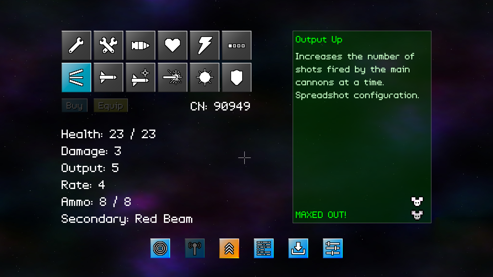 Introduction We have all our icons and widgets setup for our shop, so it's now time to introduce all the buying and equipping logic. As you'll soon, there is a little more to it than simply pressing the "Buy" button. Extract the archive, run cmake CMakeLists.txt, followed by make, and then use ./shooter3-18 to run the code. You will see a window open like the one above. Use the mouse to control the cursor. Click on the various shop items (in grey) to view information about them. Click the Buy button to purchase items. For various reasons, the Buy button might be disabled. Purchased secondary weapons can be equipped by clicking the Equip button. Only one secondary weapon can be equipped at a time. Once you're finished, close the window to exit. Inspecting the code Let's jump right in. We've had to make a number of changes outside of shop.c to make our purchasing work. We'll start with defs.h: