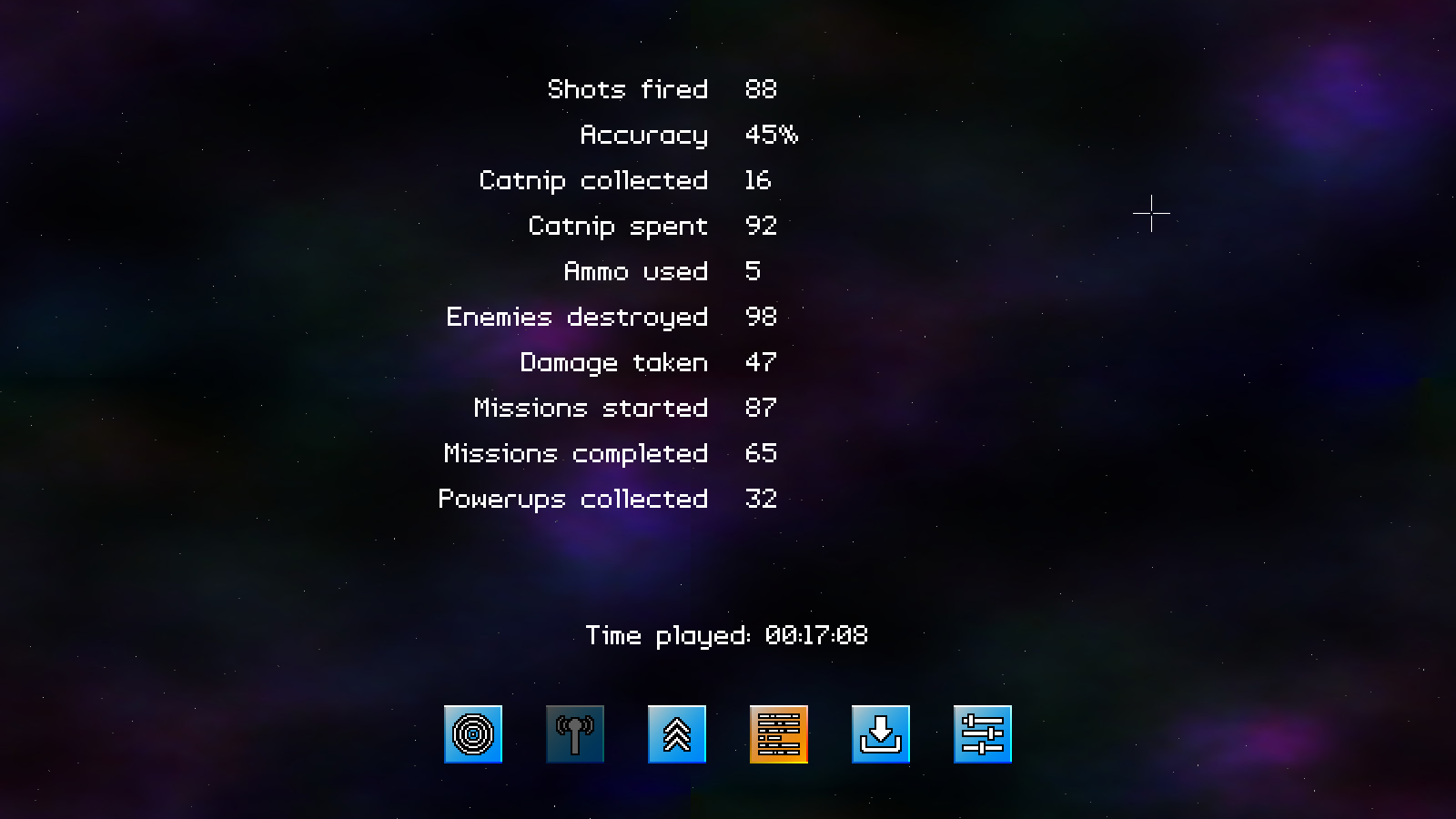 A similar IS_STATS statement has been added, to call drawStats: That's it for the screen in our intermission. All that needs adding are the stats updates themselves. We've sprinkled these throughout the code in various places, where appropriate to the stat itself. We did a similar thing in the Medals tutorial (#2, #3, #4), so we won't repeat ourselves here (examples can be found in bullets.c, fighters.c, and collectables.c). That's it for this screen. In summary, this is just a simple stats display screen, with the stats themselves being increased by various functions and events during gameplay. Ultimately, this isn't very impactful, but something that's nice to see. Something far more impactful is the ability for us to load and save our game. While our game isn't long, it would still be nice to save and reload our progress at a time of our choosing. In the next part, we're going to look at introducing the save system. Purchase The source code for all parts of this tutorial (including assets) is available for purchase: From itch.io It is also available as part of the SDL2 tutorial bundle: |