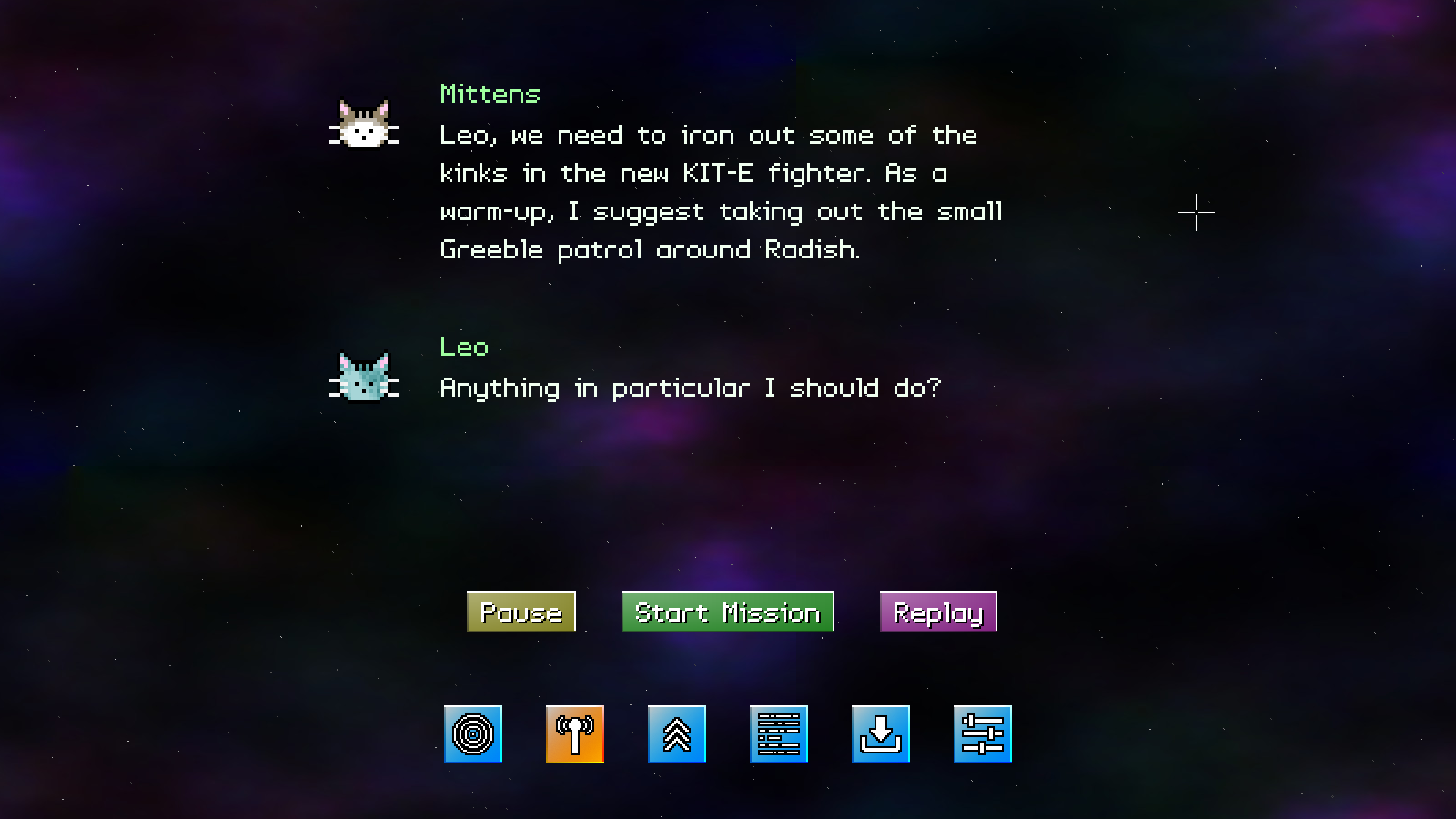 Introduction It's time to start putting in our proper missions. The first two of these missions will be the easiest to do, as they feature objectives and requirements that already exist in our code. All we need to do is add in the mission data, and make some additional tweaks. Extract the archive, run cmake CMakeLists.txt, followed by make, and then use ./shooter3-24 to run the code. You will see a window open displaying the intermission's planets screen. Select Radish, then enter the comms section to start the mission. Play the game as normal. You may repeat the mission as often as you like. Remember that you can change the fighter's damage, weapons, output, and health by editing game.c, if you wish to get ahead of things early. Once you're finished, close the window to exit. Inspecting the code Before we get started, you're likely wondering something - what exactly is this game all about? Why are cat flying starfighters? Why do the planets have such silly names? Well, the plot of our game is that sometime in the year 24XX, the human race has been wiped out by an evil alien race known as The Greebles.