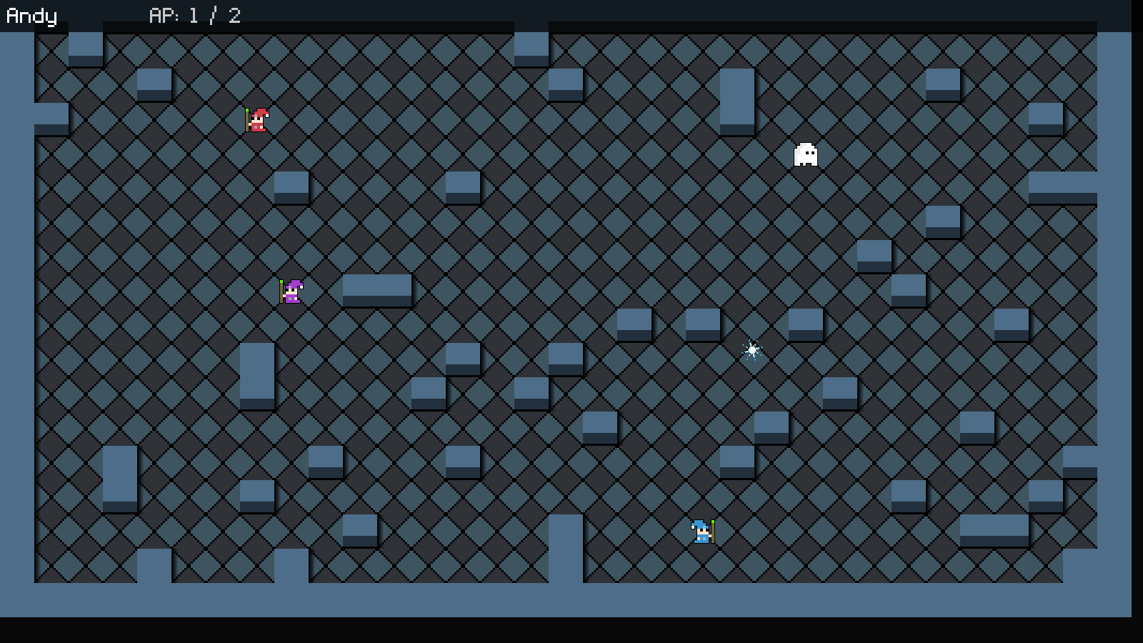 Introduction Another aspect of turn-based strategy games is combat. You don't need to have combat in a game, of course. You could make a zen-like experience where everyone and everything is passive. However, in our game our wizards need to deal with an outbreak of ghosts, so they will be using magic to dispatch them. In this part, we'll look at how we're going to handle attacking. Note that our game only uses ranged attacks. No melee combat happens. Extract the archive, run cmake CMakeLists.txt, followed by make, and then use ./sdl2TBS06 to run the code. You will see a window open like the one above, showing three wizards in a small room, surrounded by walls, as well as a white ghost. Move the mages around as normal. Clicking once on the ghost will target it. Notice the red pulsing square that appears. Clicking again will result in the current wizard attacking (so long as they have AP to do so). Attacks will always hit and will always kill the target. Once you're finished, close the window to exit. Inspecting the code Adding in combat is quite a process, so we're going to do this over the next several parts of this tutorial. First, we're going to add in our targetting, firing, and target elimination. To begin with, let's update structs.h: