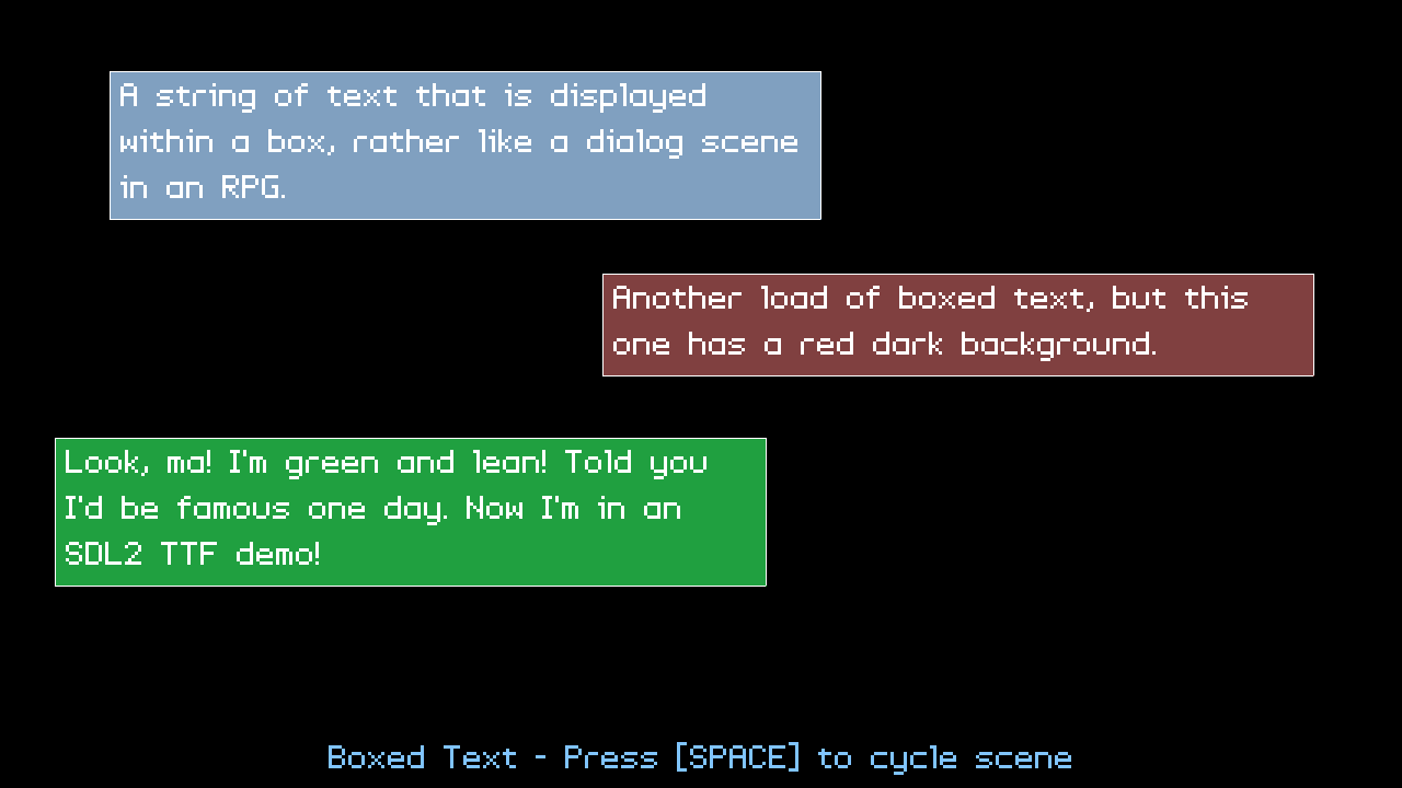 Introduction So, we can draw text from a text atlas, and also grab it pre-made from a direct SDL2 TTF call. But what if we want to do extra things. You will have noticed in the last tutorial how the text from one line was too long to fit onto the screen; it should really wrap onto the line below and not overdraw. In this tutorial, we'll look at how we can achieve this, along with a few other things. Extract the archive, run cmake CMakeLists.txt, followed by make, and then use ./ttf03 to run the code. You will see a window open like the one above, with a number of coloured boxes, each containing a line of text, wrapped to fit within its bounds. This demo contains a number of different scenes. Pressing the space bar will cycle through them. Close the window to exit. Inspecting the code Scrolling this page, you'll notice it's quite long. Yep, this is another somewhat complicated tutorial and we'll be going into a lot of detail. We'll make a start with defs.h where we've added a new enum: