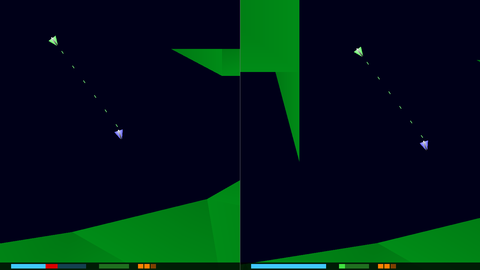 Introduction It's time to fully implement our combat system. We have a lot of other things in place, but one of the tenants of our gameplay - the ability for the players to battle one another - has been quite absent. In this part, we'll finally fix all that. Extract the archive, run cmake CMakeLists.txt, followed by make, and then use ./versus08 to run the code. You will see a window open like the one above, with each player on either side of our zone. Use the default controls (or, at your option, copy the config.json file from a previous tutorial, to use that - remember to exit the game before copying the replacement file). Play the game as normal. Players have unlimited lives, and will respawn whenever they are defeated. Notice how your guns can overheat and stop firing if you try to use them for too long. Also note that only three rockets are available, per life. Once you're finished, close the window to exit. Inspecting the code Adding in our fully realised combat is simple enough, and sticking with our plan to keep these updates short and concise, we'll discover there isn't anything difficult to deal with. Once again, if you've been following these tutorials through from the beginning, you won't find anything out of the ordinary. Let's dive in! Starting first with defs.h: