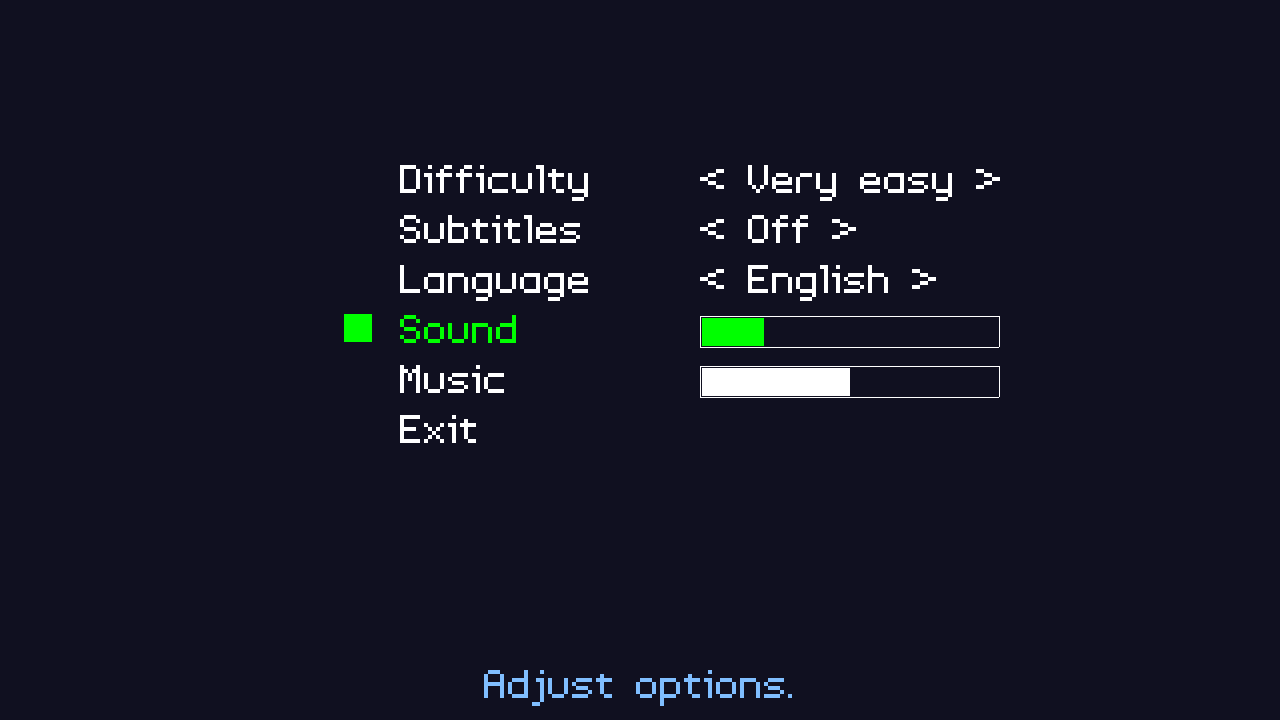 Introduction We're going to introduce another new widget now: a slider. This is the sort of widget that one might use for volumes. If you're offering the ability to change the volume of the sound, music, voices, etc. in games, then a slider widget will be most suitable. Extract the archive, run cmake CMakeLists.txt, followed by make, and then use ./widgets05 to run the code. You will see a window open like the one above. Use the Up and Down arrows on you keyboard to change the highlighted menu option. Press Left and Right to change the value of the Slider widgets (sound and music). Note how you can hold the arrows for Sound, but must press it to adjust Music. When you're done, either select Exit or close the window. Inspecting the code We've added a slider widget JSON to our options.json file. The definition of the sound widget is like this: